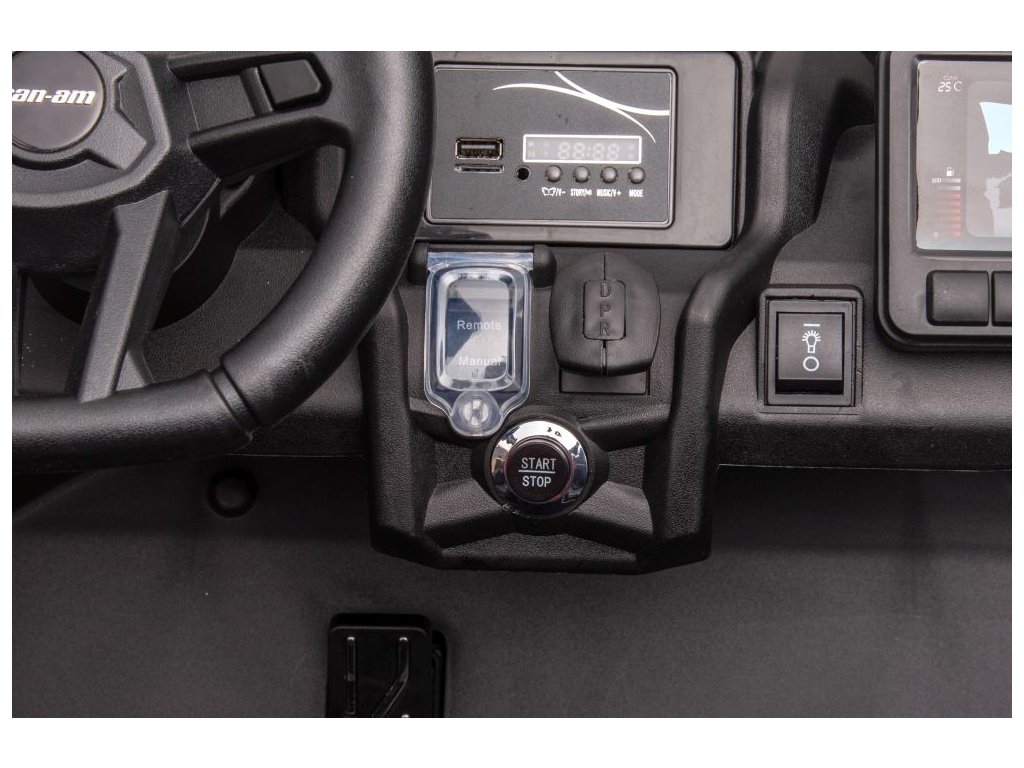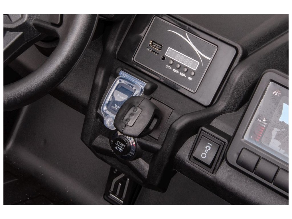 Autíčko můžete ovládat pomocí dálkového ovládání, které pracuje na frekvenci 2,4 GHz. Na dálkovém ovladači jsou tři rychlosti a bezpečnostní tlačítko STOP, které po zmáčknutí okamžitě zastaví autíčko. Sedačka je pokryta ekologickou kůží a nachází se na ní bezpečnostní pásy. Vozidlo má nastavitelné přední sedadlo - sedadlo lze posunout blíže k volantu.
