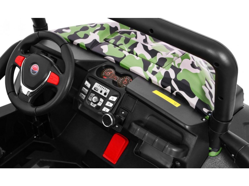 Dětské elektrické autíčko Buggy bez větších problémů zvládá jízdu po terénu a různé převýšení. Díky vysokému podvozku je přímo určené pro jízdu v terénu a přes louže. Pokud máte doma malého závodníka, případně závodnici, pak je toto autíčko stvořené pro Vás. Po stisknutí startovacího knoflíku se ozve startovací zvuk a rozsvítí se přední světla. Ty lze přepínat pomocí tlačítka na ovládacím panelu. Mohou svítit, blikat nebo jednoduše zůstat vypnuté. V autíčku můžete naladit FM rádio, spustit nahranou hudbu nebo jej spárovat s telefonem pomocí BT funkce a přehrávat hudbu přímo z telefonu. Díky třem předehraným písničkám pomůžete dětem se zdokonalovat v angličtině. Tyto funkce dítě přepíná pohodlně i na volantu. Na panelu můžete ovládat hlasitost, což ocení hlavně rodiče :)