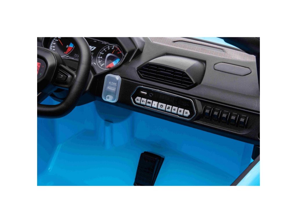 Autíčko můžete ovládat pomocí dálkového ovládání, které pracuje na frekvenci 2,4 GHz. Na dálkovém ovladači jsou tři rychlosti a bezpečnostní tlačítko STOP, které po zmáčknutí okamžitě zastaví autíčko. Sedačka je pokryta ekologickou kůží a nachází se na ní bezpečnostní pásy.