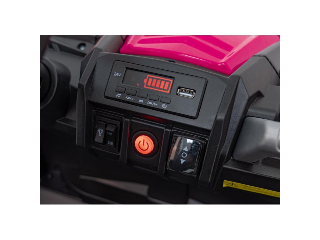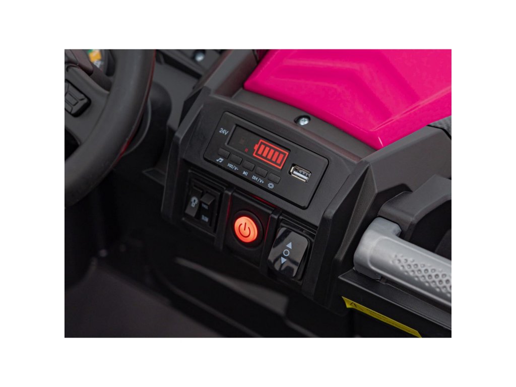 Elektrické autíčko Buggy UTV se silnými motory o celkovém výkonu 800W nesmí chybět v žádné dětské garáži. Autíčko je poháněno baterii s kapacitou 24V 9Ah. Maximální zatížení vozítka je 60 kg. Během jízdy dítě určitě zaujme hudební panel s MP3, Bluetooth a USB.