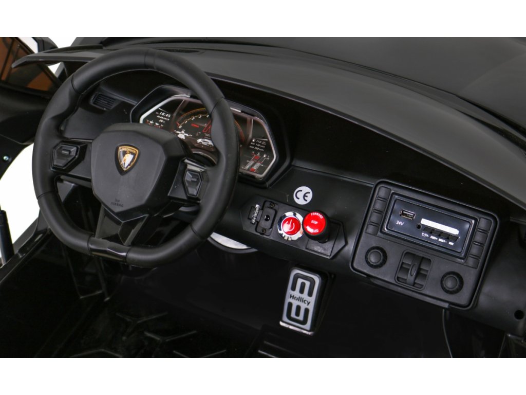 Dětské elektrické autíčko licencované společností Lamborghini je vybaveno exkluzivní sedačkou z ekologické kůže, hudebním panelem se vstupy MP3, USB, tlačítky s předem nahranými melodiemi a předními i zadními LED světly. Při startování uslyšíte charakteristické zvuky motoru.