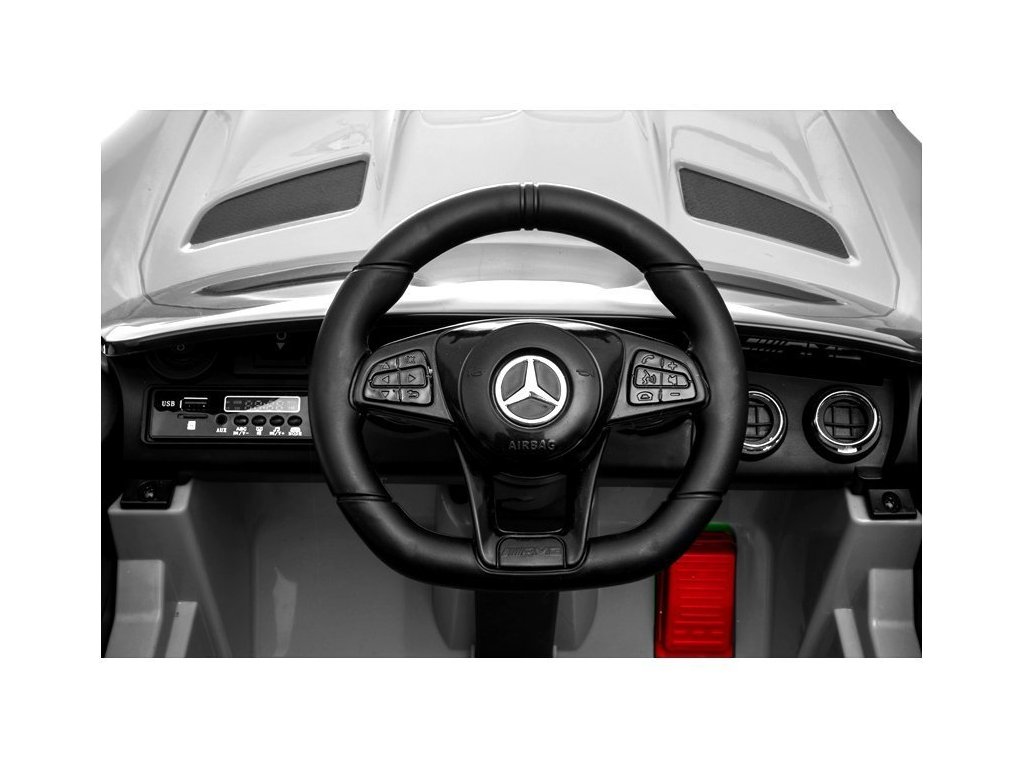 Dětské licencované elektrické autíčko Mercedes GTR přijíždí na měkkých pěnových EVA kolech, která jsou tichá a přizpůsobí se různým typům terénu. Dítě se posadí do pohodlně tvarované sedačky z ekologické kůže a o bezpečnost se postarají bezpečnostní pásy.