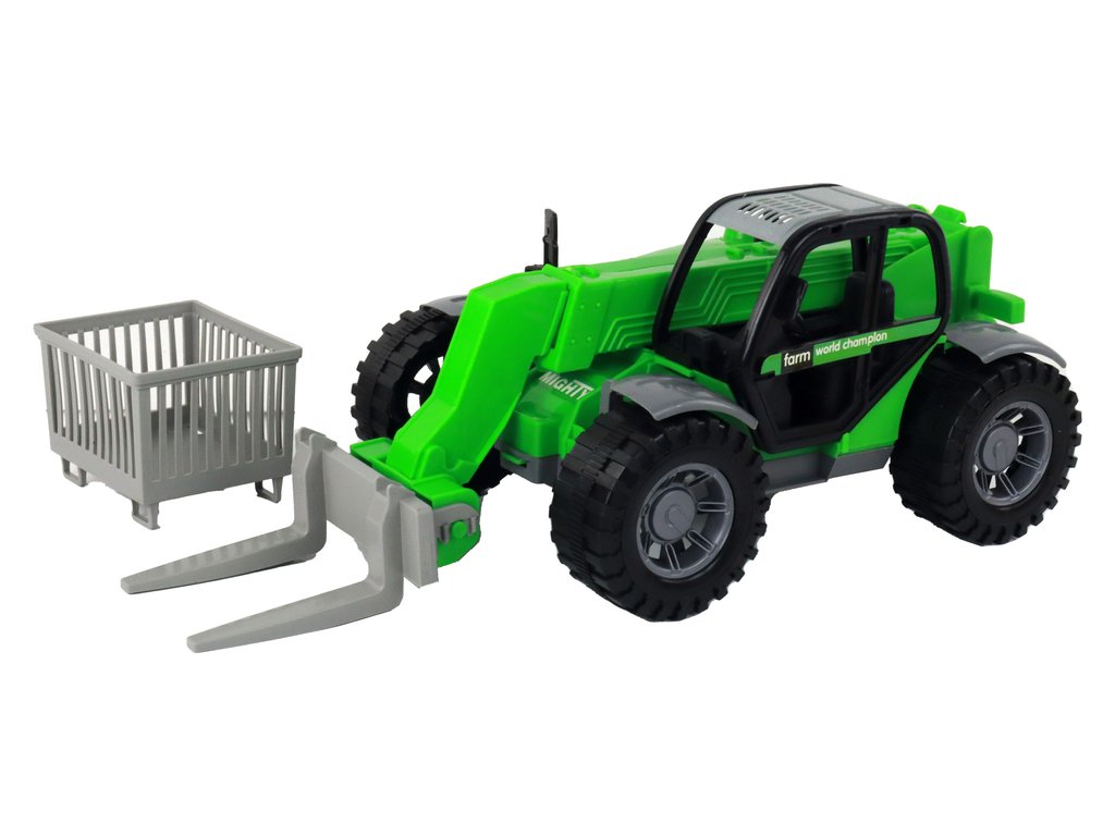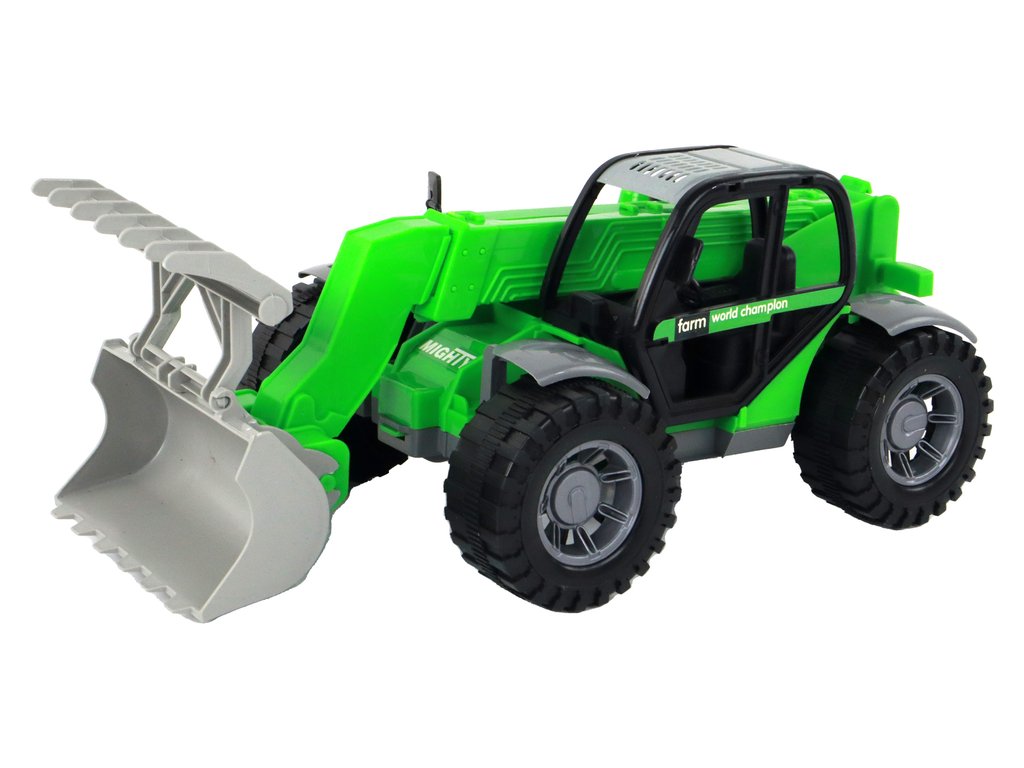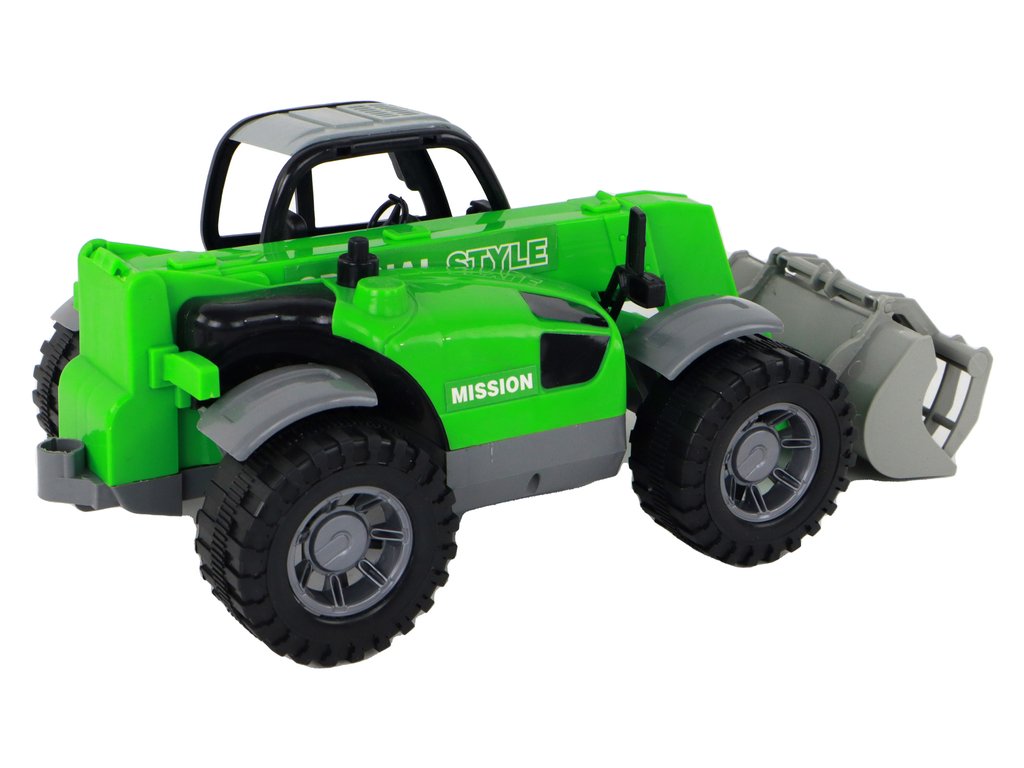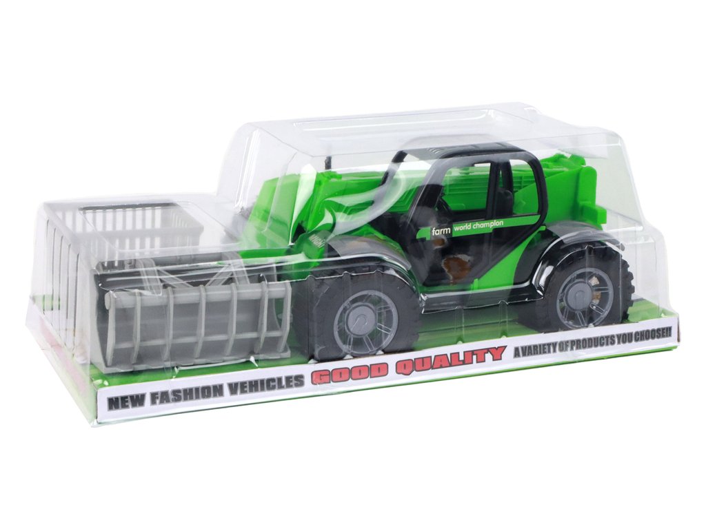 Vozidlo je vybaveno velkými, černými koly, které mu umožňují pohybovat se po různých typech povrchů. Interiér kabiny traktoru je viditelný skrze průhledná okna, což umožňuje dětem nahlédnout dovnitř. Traktor má tři různé nástavce, které lze snadno nasadit a vyměňovat podle potřeb.