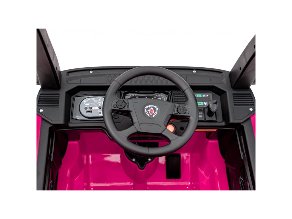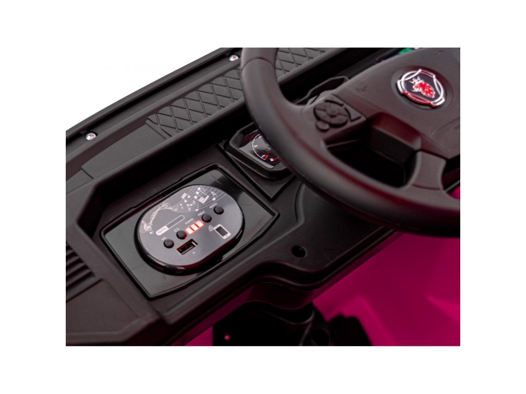 Uvnitř čeká pohodlné sedadlo potažené eko kůží, vybavené bezpečnostními pásy. Dítě si může užít zábavu díky vestavěnému MP3 přehrávači s Bluetooth, USB vstupem a tlačítky zvukových efektů a klaksonu přímo na volantu. Nechybí melodie, realistické zvuky startu motoru a indikátor stavu baterie.