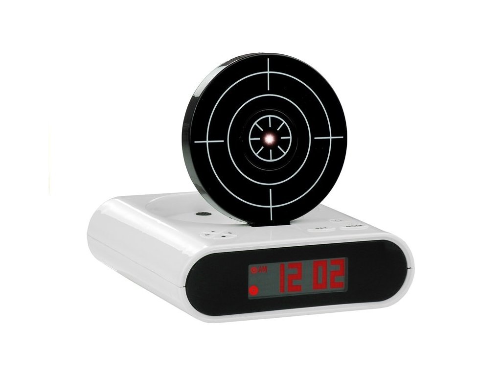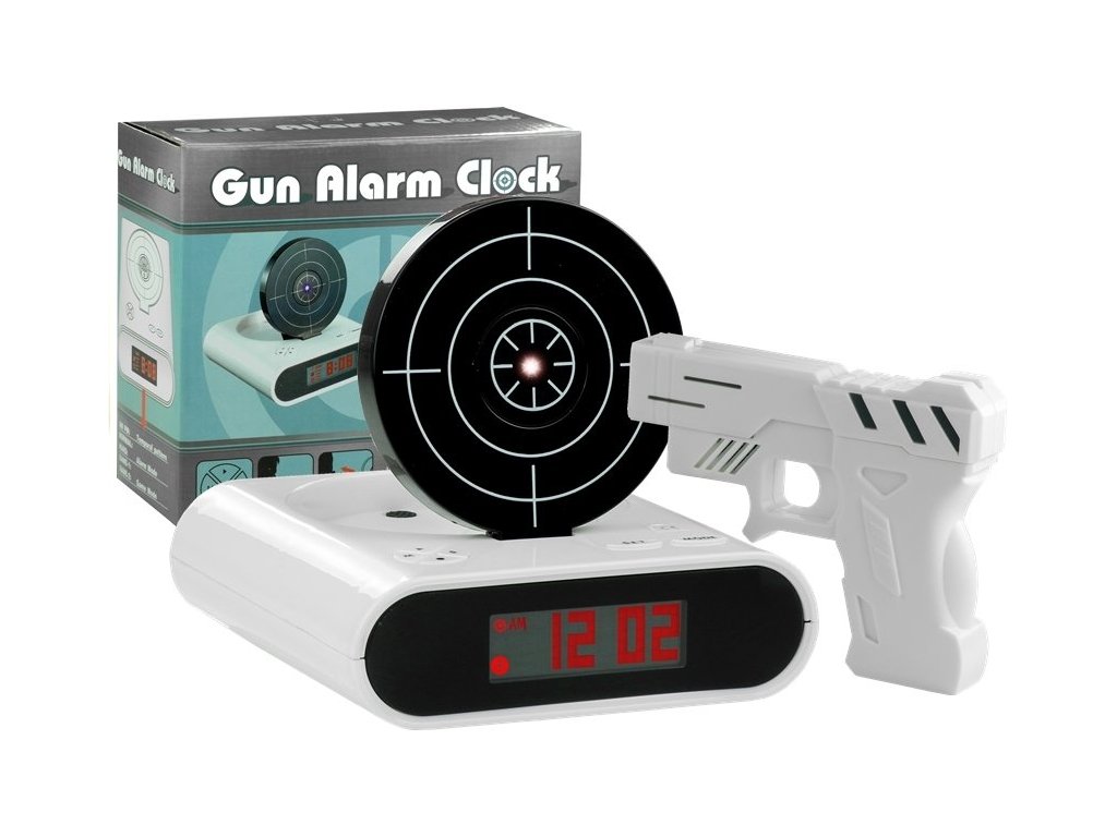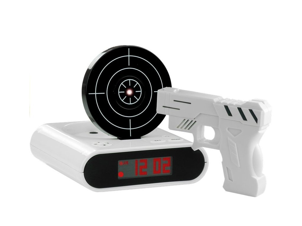 Budík s moderním designem je něco, co probudí i ty největší spáče. Vypnutí není tak snadné, jak by se mohlo zdát – měli byste mířit pistolí paprskem červeného světla na štít s hladkým pohybem ruky. Výhody prezentovaného budíku jsou nejen zajímavým designem. Na rozdíl od klasických hodinek pracuje tiše, je precizní a velký černý displej vám umožní přečíst si čas i uprostřed noci. A navíc je to skvělá hračka! K budíku je připevněna bílá zbraň, kterou můžete střílet na budík.