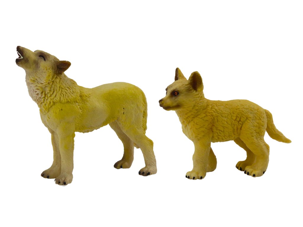 Dospělý vlk byl perfektně ztvárněn s důrazem na nejmenší detaily, ukazuje jeho majestátní vzhled a charakteristické rysy. Naproti tomu mladý vlk vyzařuje energii a zvědavost, ideální pro hraní i sběratelství.