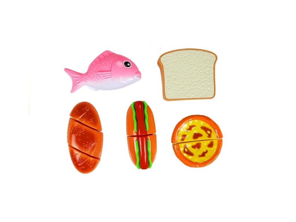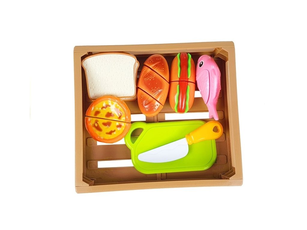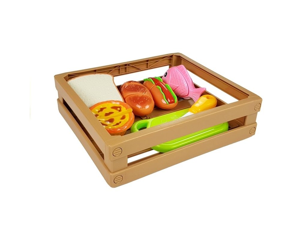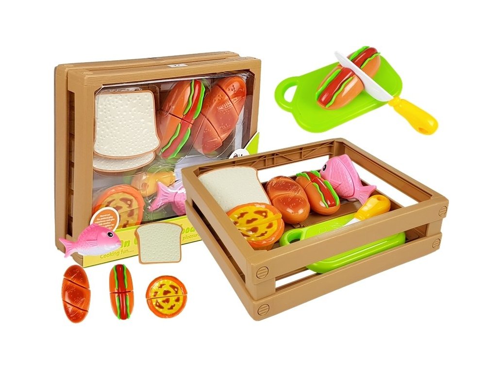Dřevěná sada potravin je skvělou hračkou pro dítě, které sní o samostatné přípravě pokrmů. Sada se skládá z velkého množství prvků, které zaručují skvělou zábavu, při které můžete vytvořit mimo jiné párek v rohlíku, stejně jako naservírovat rybu nebo cupcake jako dezert.