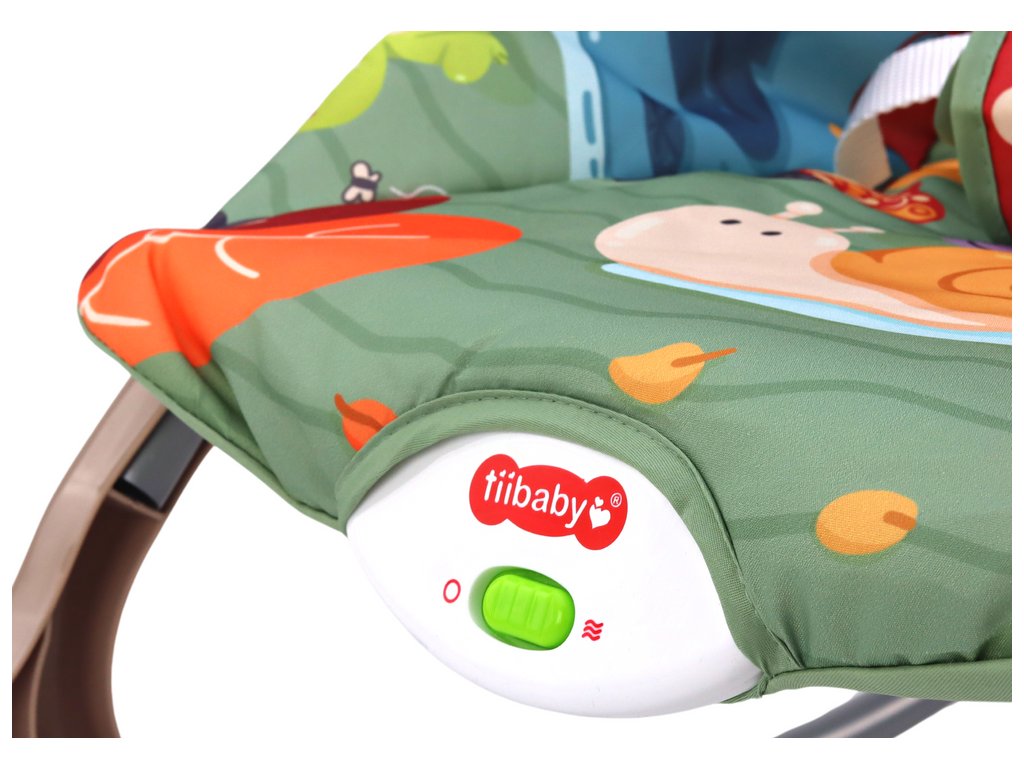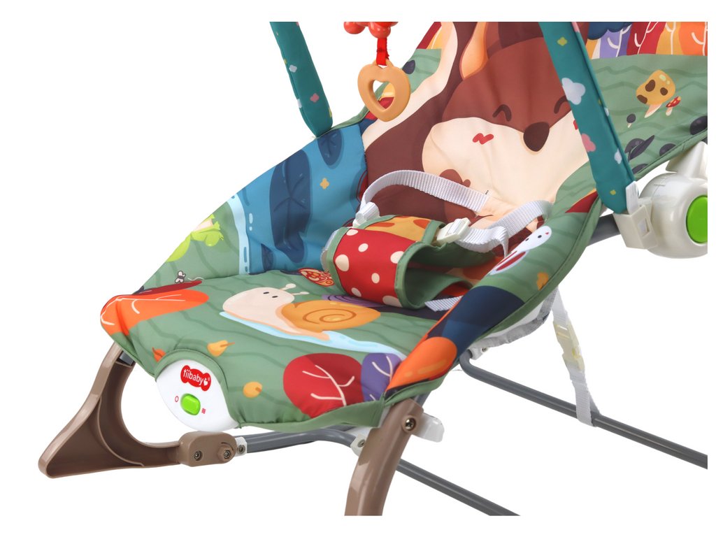Potah houpacího křesla zdobí rozkošný motiv lesních zvířátek, díky němuž je každá chvíle strávená v něm plná dobrodružství a radosti. K houpacímu křeslu je připevněna čelenka s přívěsky zobrazujícími roztomilá zvířátka - lišku, berušku a motýla. Zatáhnutím za srdíčko připevněné k lišce se ozve veselý zvuk melodie, který dítě dále povzbuzuje k interakci a zkoumání.