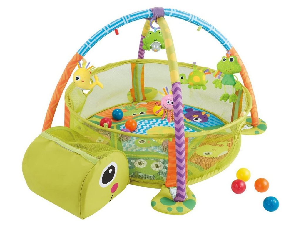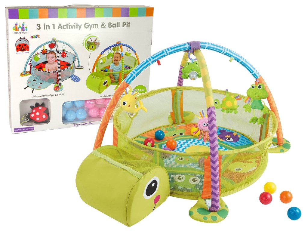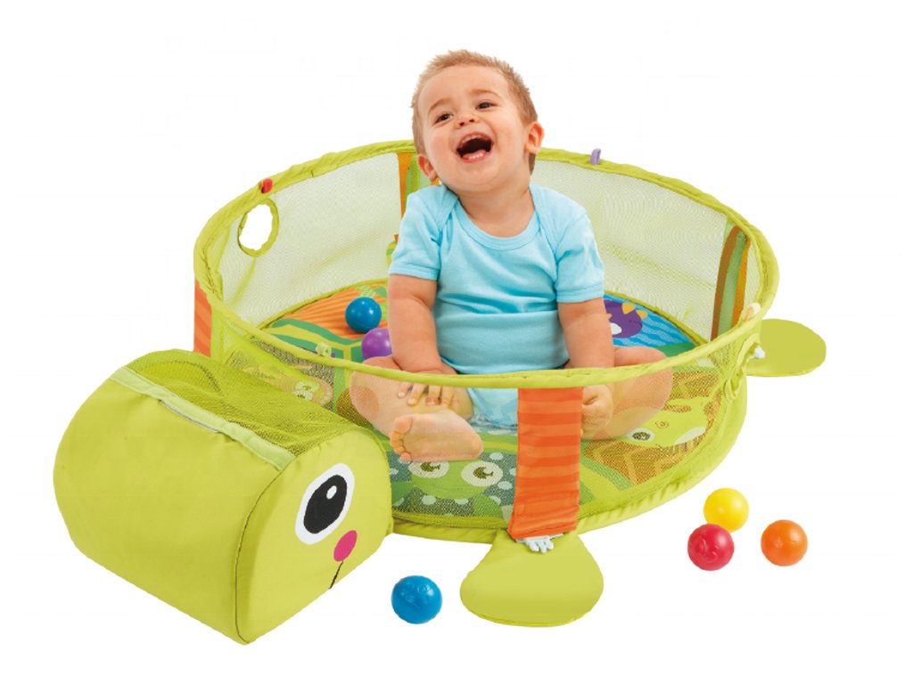 Hrací podložka pro miminko je vybavena odnímatelnými hrazdičkami, na které lze zavěsit hračky. Plyšové hračky lze odejmout a použít jako chrastítko. Hrací deka je vyrobena z velmi příjemného materiálu na dotek. Hračka pomáhá rozvíjet představivost a motorické schopnosti. Do hlavy želvy jde uschovat míčky.