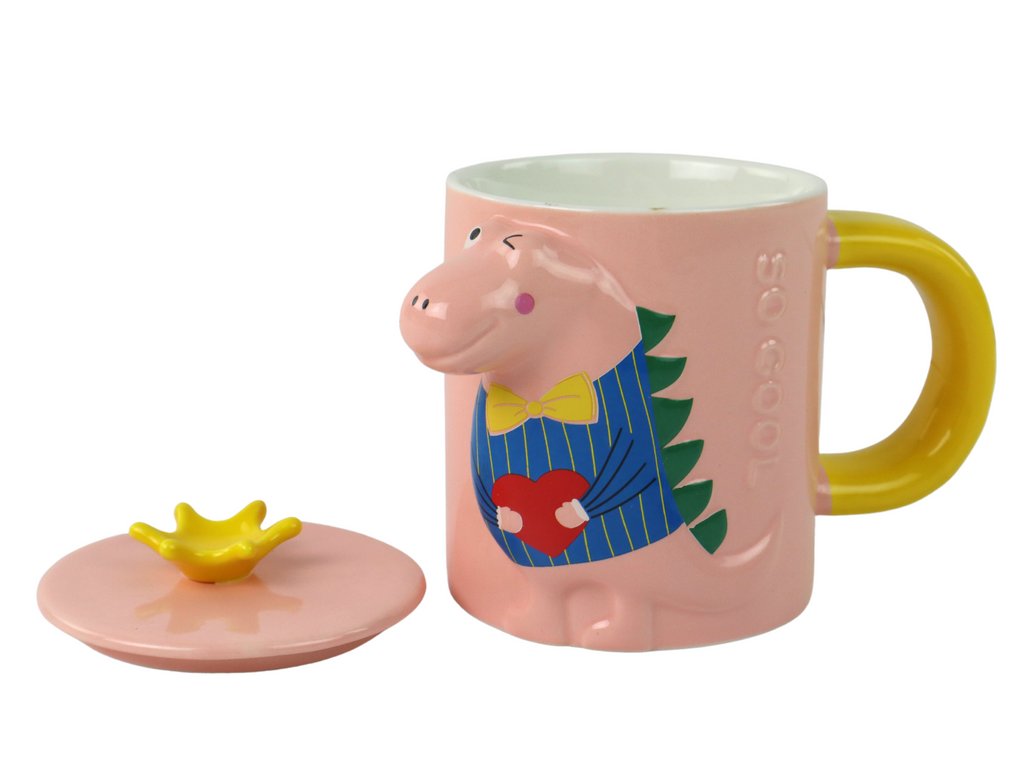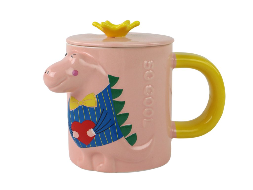 Hrneček s neobvyklým trojrozměrným motivem dinosaura, který je vyražen na povrchu. Dinosaurus je oblečený v různých barvách, což přidává zábavný a estetický prvek.
