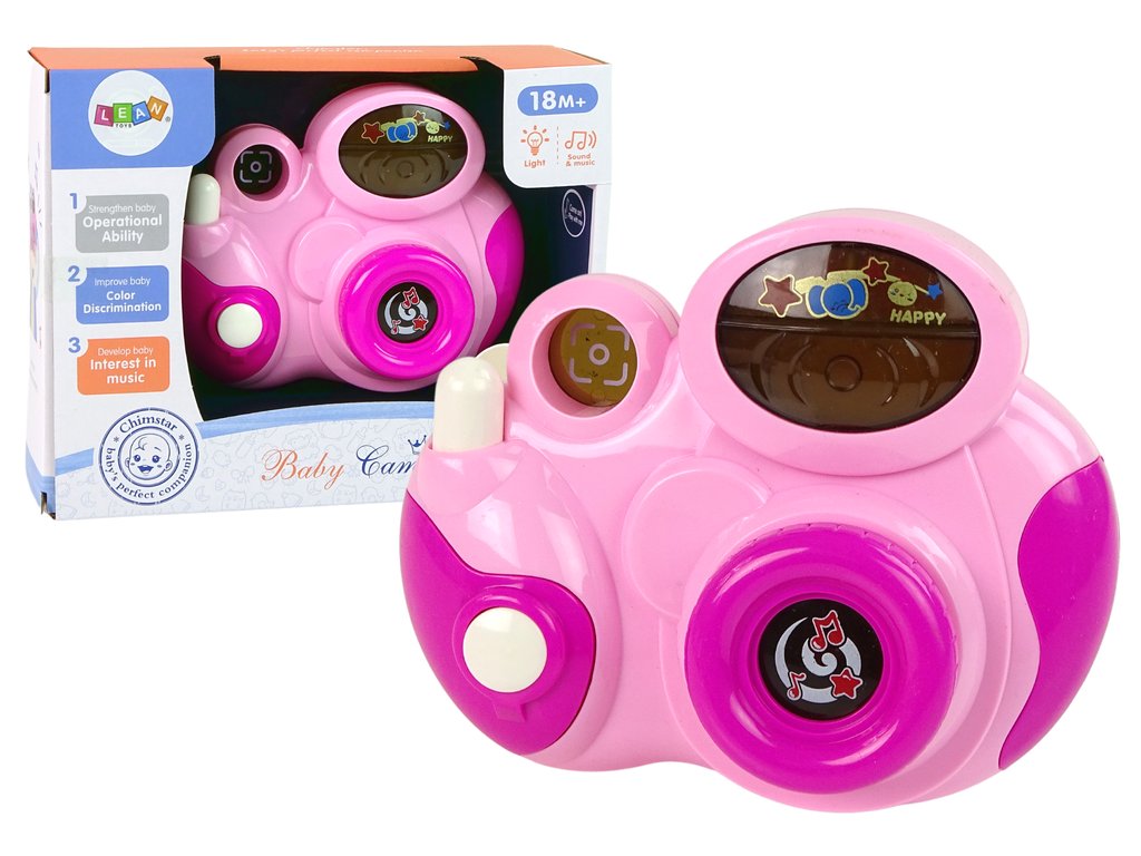 Má skutečné zvuky fotoaparátu: vydává zvuk „cvaknutí“ skutečného fotoaparátu. Má 3 melodie při stisknutí tlačítek a také barevná světla pro simulaci blesku. Interaktivní kamera rozvine koordinaci oko-ruka vašeho dítěte.