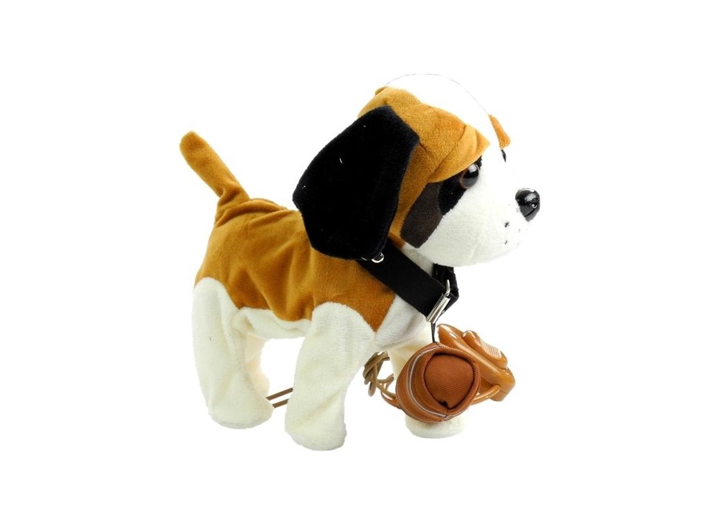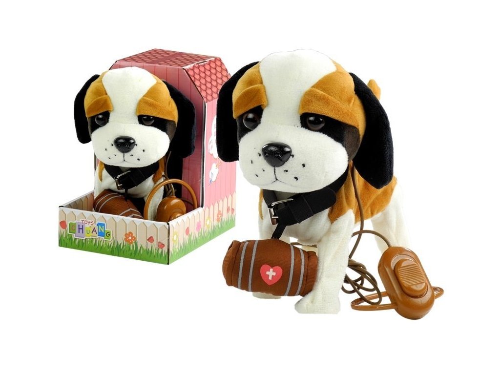 Pejsek na vodítku rasy bernardýn je interaktivní hračka vyrobená z netoxického a příjemného materiálu. Má dlouhé vodítko s přepínačem, takže dítě může snadno ovládat svého mazlíčka. Pejsek také umí tancovat a zpívat, což je pro dítě další atrakcí.