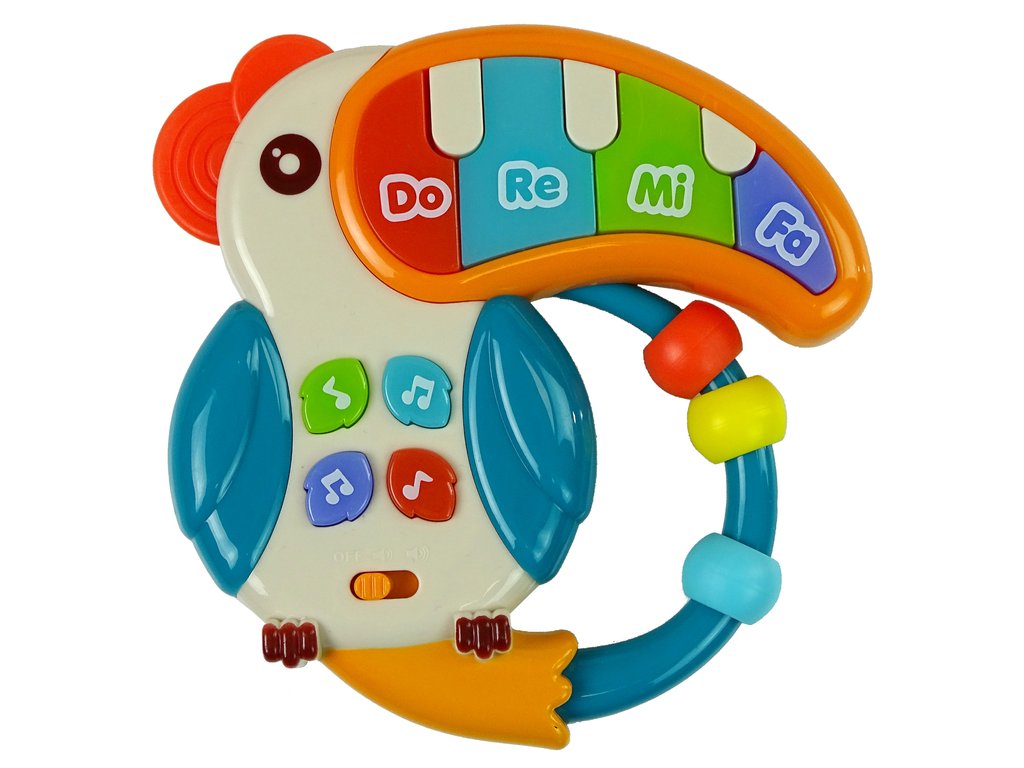 Dětské piano ve tvaru papouška je perfektní hračka pro nejmenší děti. Na zobáku se nachází klávesy „DO“, „RE“, „MI“ a „FA". Při hře na klávesy je zobák papouška podsvícený. Na těle papouška jsou čtyři tlačítka s notami, které přehrají veselé a klidné melodie. Na straně se nachází madlo s třemi korálky. Hračka má tlačítko, které umožňuje přepínat mezi dvěma úrovni hlasitosti.