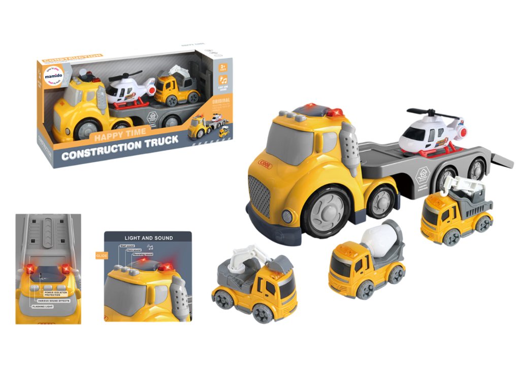 Zábavná sada pro malé fanoušky stavebních a záchranářských strojů! Velký žlutý tahač s vlečkou převáží vrtulník a nákladní auto, takže si děti mohou zahrát na staveniště i záchrannou akci. Model je doplněn o světelné a zvukové efekty, které hru ještě více oživí.