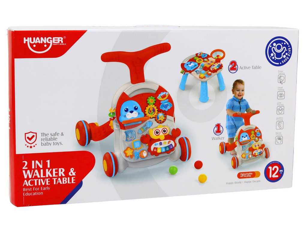 Chodítko Stolek 2v1 v červené barvě. Naše chodítko bylo navrženo s ohledem na zajištění spousty zábavy pro vašeho malého, zároveň podporuje jeho manuální a motorický rozvoj.