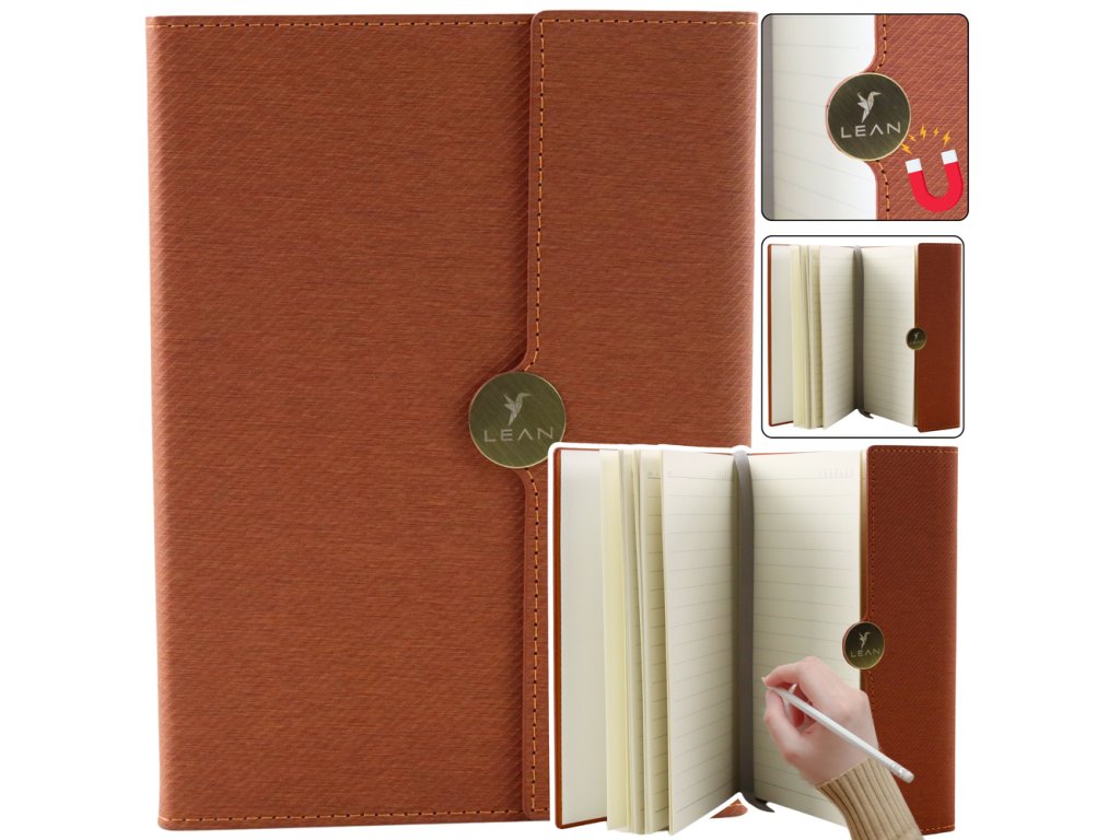 Elegantní kancelářský zápisník formátu A5 s magnetickým uzávěrem a hnědým potahem spojuje styl a funkčnost. Jeho pevné magnetické zapínání chrání obsah před nechtěným otevřením a znečištěním, zatímco vysoce kvalitní tvrdý potah zajišťuje dlouhou životnost.