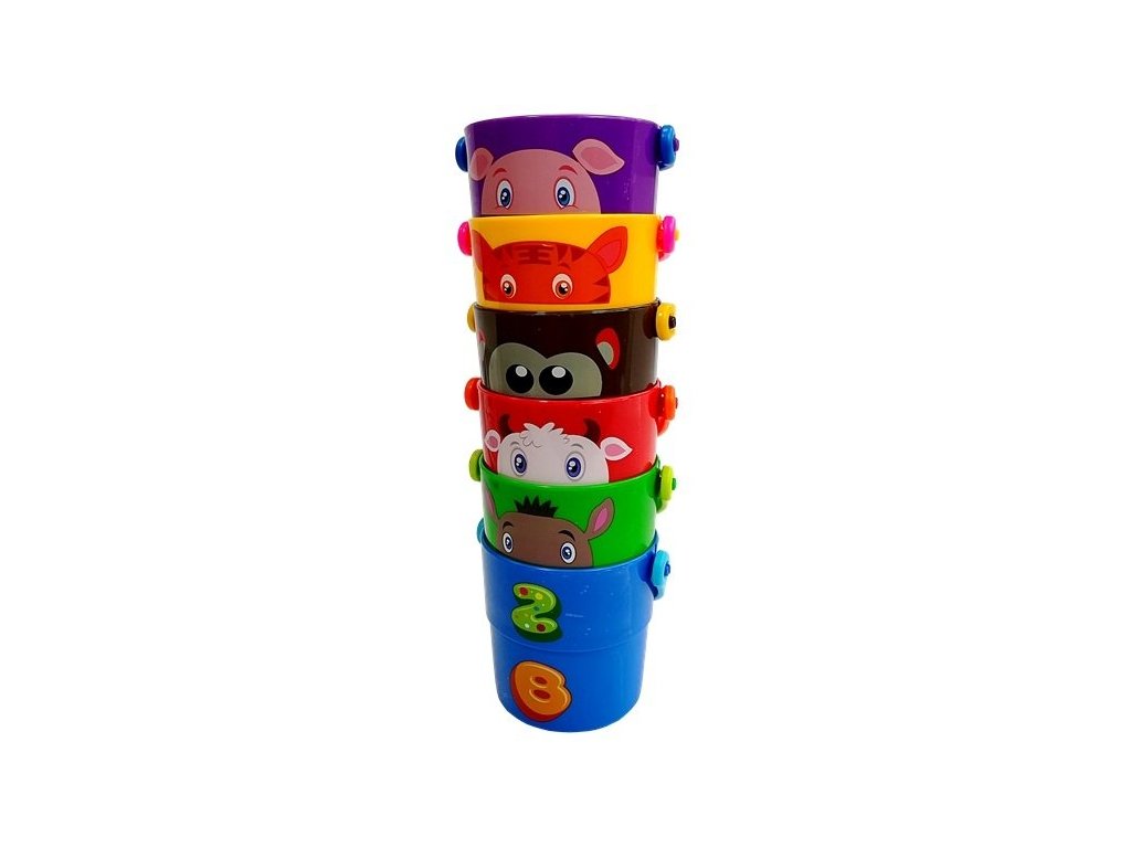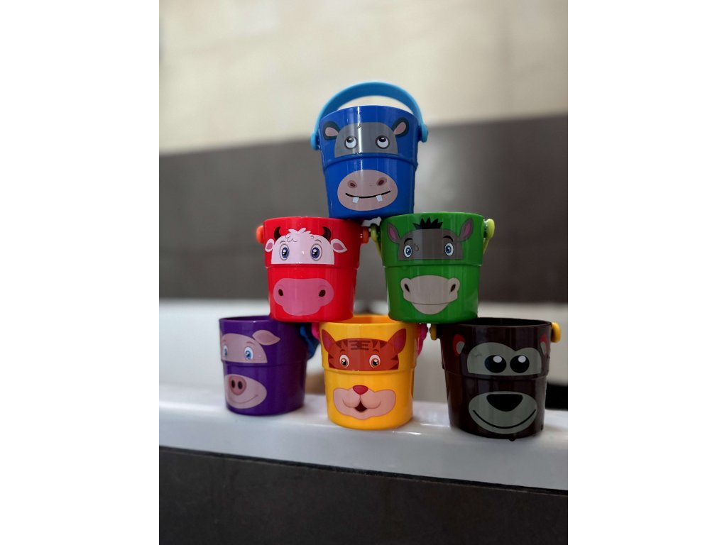 Barevné kbelíky jsou skvělé do vody, na pískoviště i na pláž. Zábava ve vodě bude s barevnými kbelíky ještě lepší. Set 6 kbelíků má motivy veselých zvířátek, například medvídek, tygr či krávy. Kbelíky do sebe krásně zapadnou a můžete tak tvořit pyramidu.