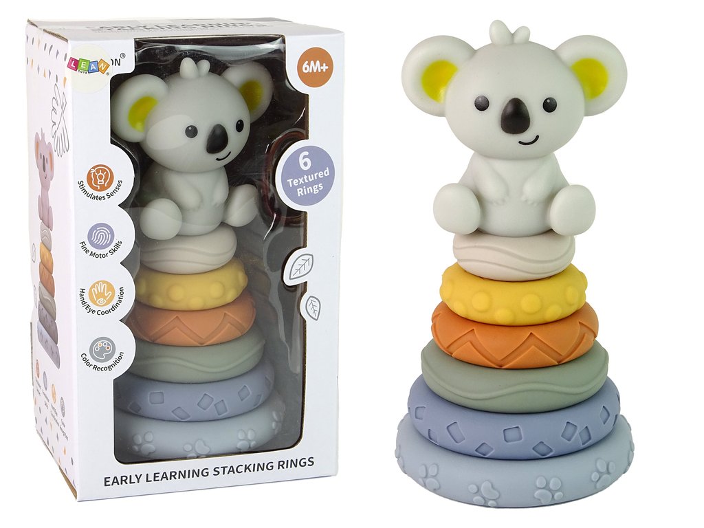 Na vrcholu pyramidy je roztomilá koala, která vzbuzuje zájem a podporuje hru. Děti budou rády zkoušet otáčet a skládat disky do různých konfigurací, což rozvíjí jejich motoriku, koordinaci ruka-oko a logické myšlení.