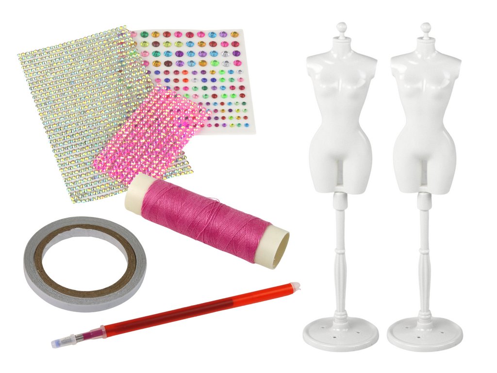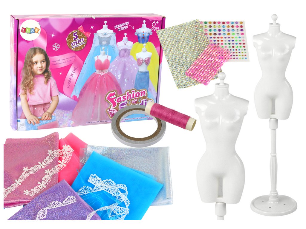 Tato sada je skutečnou pastvou pro fantazii a smysly. Dva elegantní stojánky na šaty vytvářejí dokonalé místo pro vystavení vytvořených výtvorů. Pět různých sad materiálů umožňuje volně experimentovat s barvami, texturami a vzory.