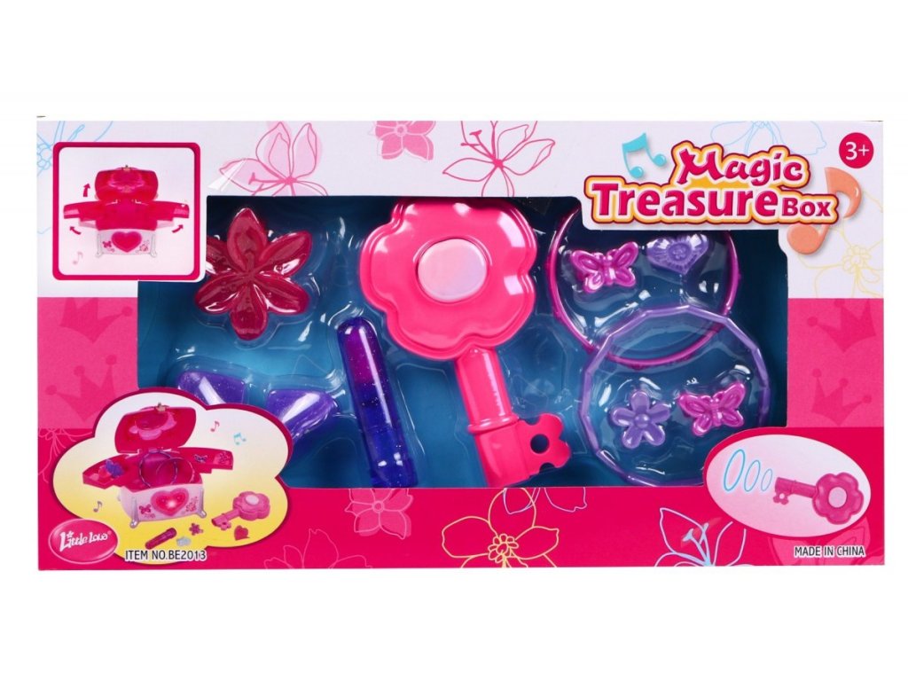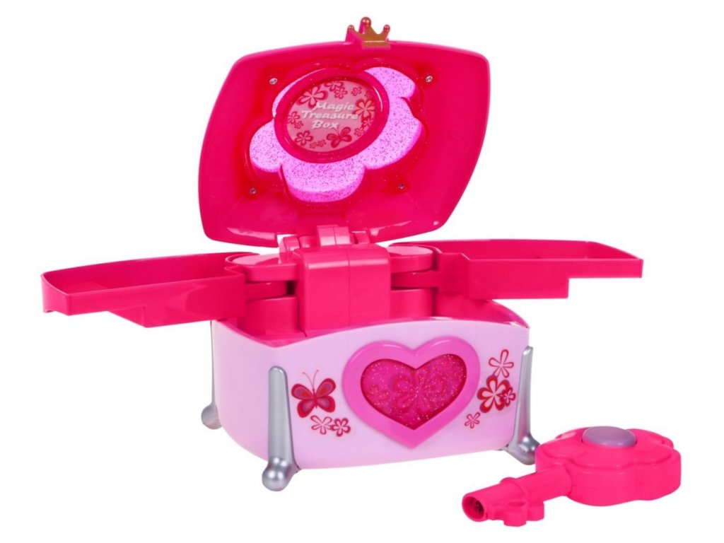 Krásně vyrobený, barevný kufřík s zářícím srdcem. Kufřík lze odemknout a zamknout klíčem, je doprovázený zvuky, které jsou příjemné pro ucho. Vaše dcera se může cítit jako skutečná princezna s kouzlem. Hračka je určená pro děti starší 3 let a má certifikát CE. Hračka poháněná 3 x AA bateriemi (není součástí dodávky).