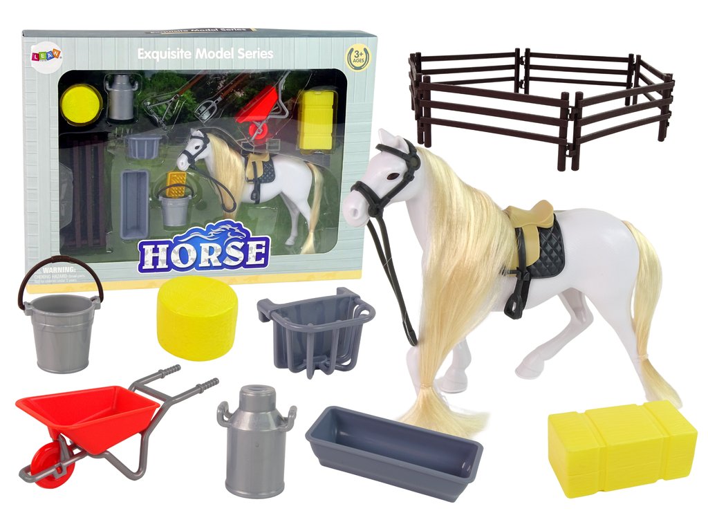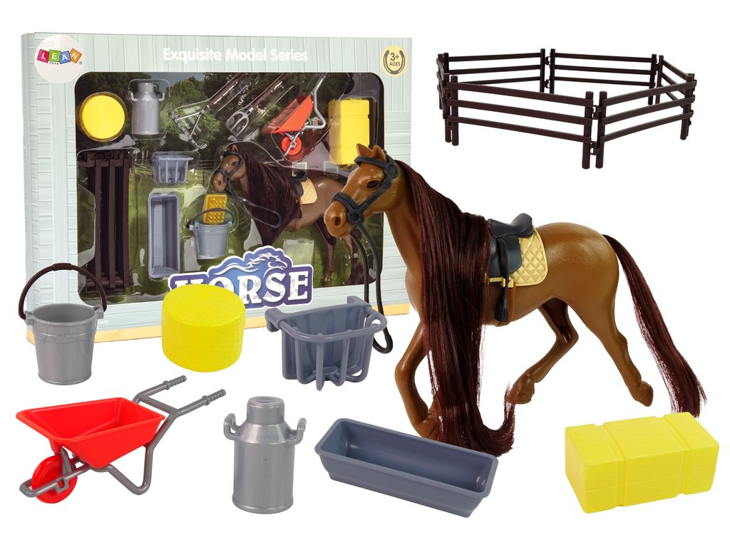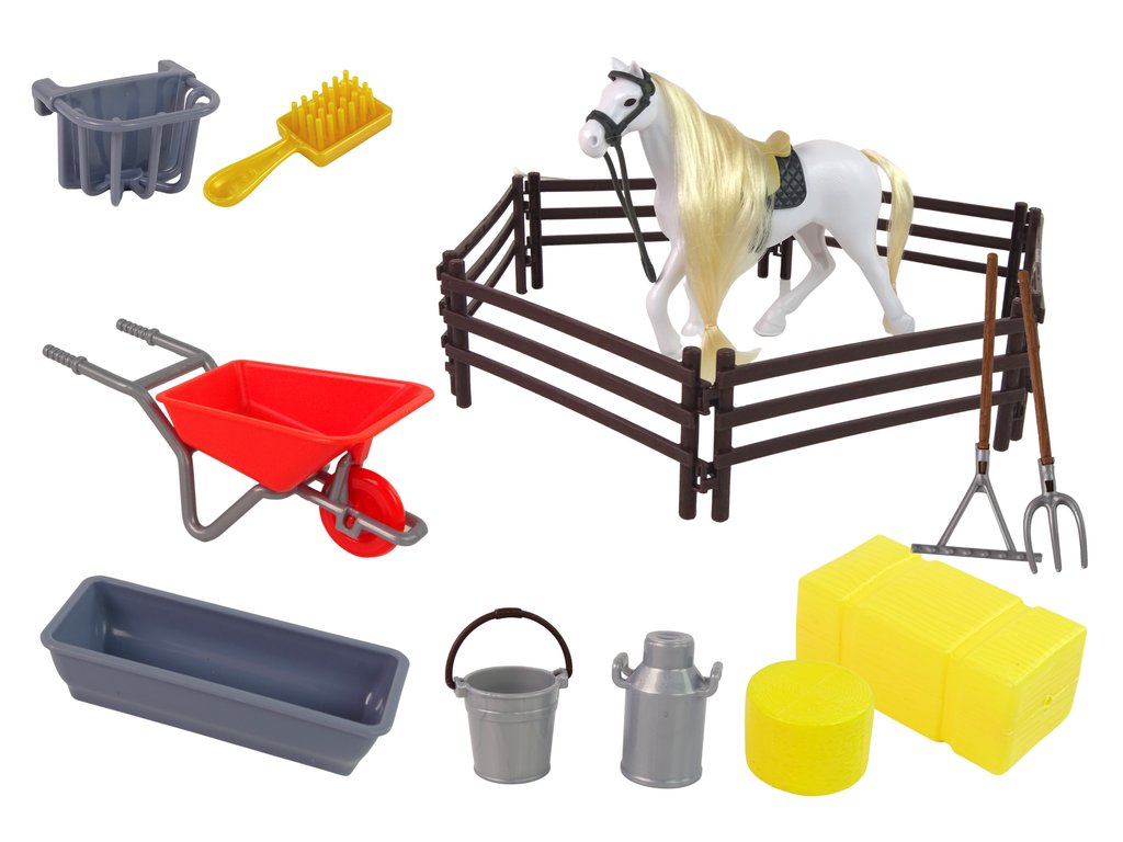 Sada se skládá z figurky koně s dlouhou hřívou, která je ideální pro česání a zaplétání. Kromě toho sada obsahuje doplňky nezbytné pro každodenní život a udržování pořádku ve stáji, jako je trakař a hrábě. To však není vše, musíte se postarat o to, aby měl kůň co jíst a pít, k tomu budete potřebovat napáječky a seno. Místo, kde budou mít koně svůj výběh, označíte speciálním plotem.