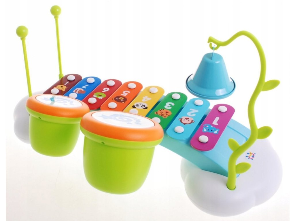 Krásně barevný a detailně zpracován dětský cimbál bude perfektní hračkou pro všechny malé hudebníky! Cimbál je postaven na dvou podstavcích ve formě obláčků, v jednom z nich se nachází výsuvný šuplík s 6 hudebními kartami, na kterých je jednoduchou formou znázorněn postup hraní různých skladeb. Dítě může hrát na 8 barevných klávesách, 2 bubíncích a zvonečku. K hraní poslouží 2 paličky. Díky kovovým destičkám vydávají cimbálky velice krásný zvuk.