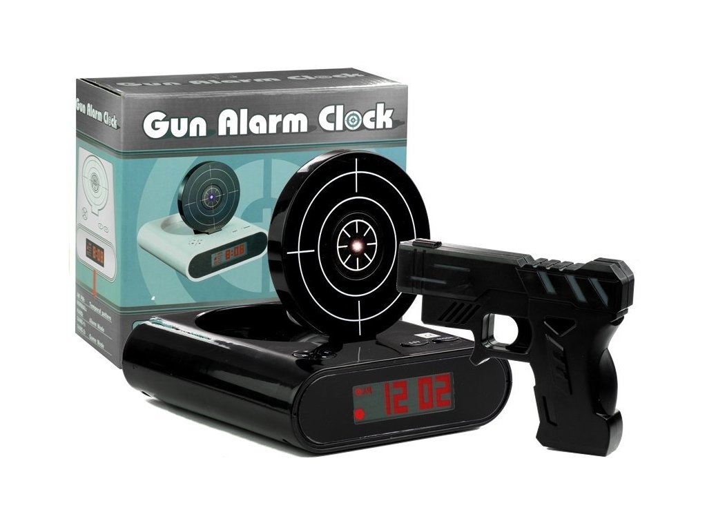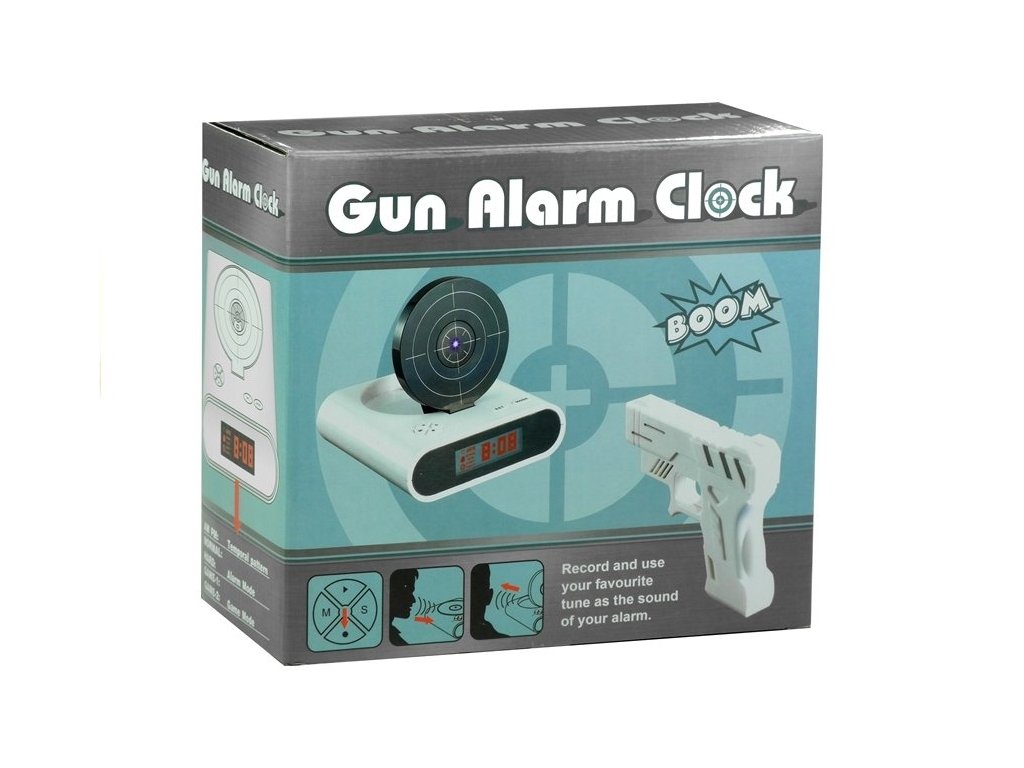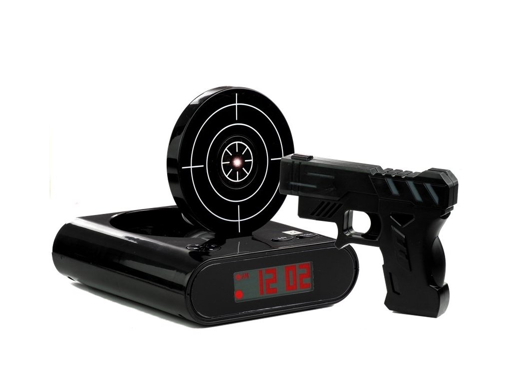 Přednosti uvedeného budíku jsou nejen v atraktivním designu. Na rozdíl od klasických hodinek pracuje tiše, je přesný a jeho velký, černý displej umožňuje odečítat čas i uprostřed noci. Navíc — je to taky skvělá hračka! K budíku je přidána černá pistole, kterou lze střílet do terče budíku. Cvikejte přesné střely každé ráno! Kromě toho můžete nahrát vzkaz nebo oblíbenou melodii, která vás bude probouzet každý den — výběr je neomezený, záleží jen na vás a vašem vkusu.