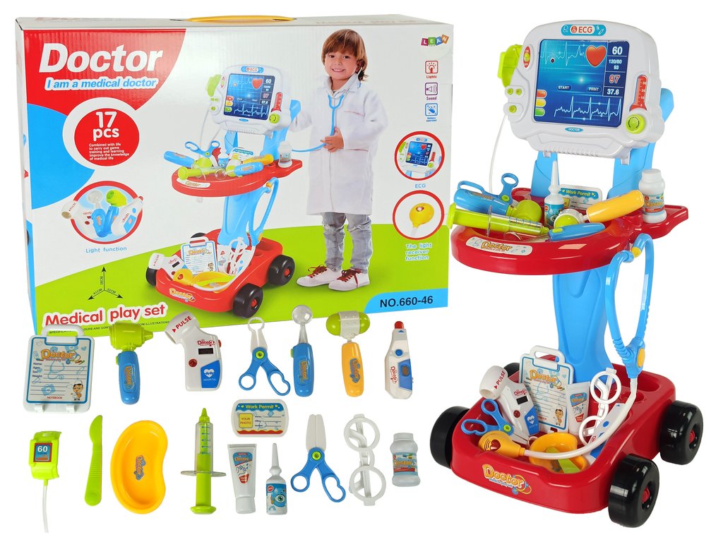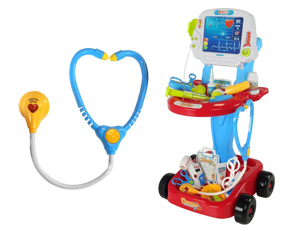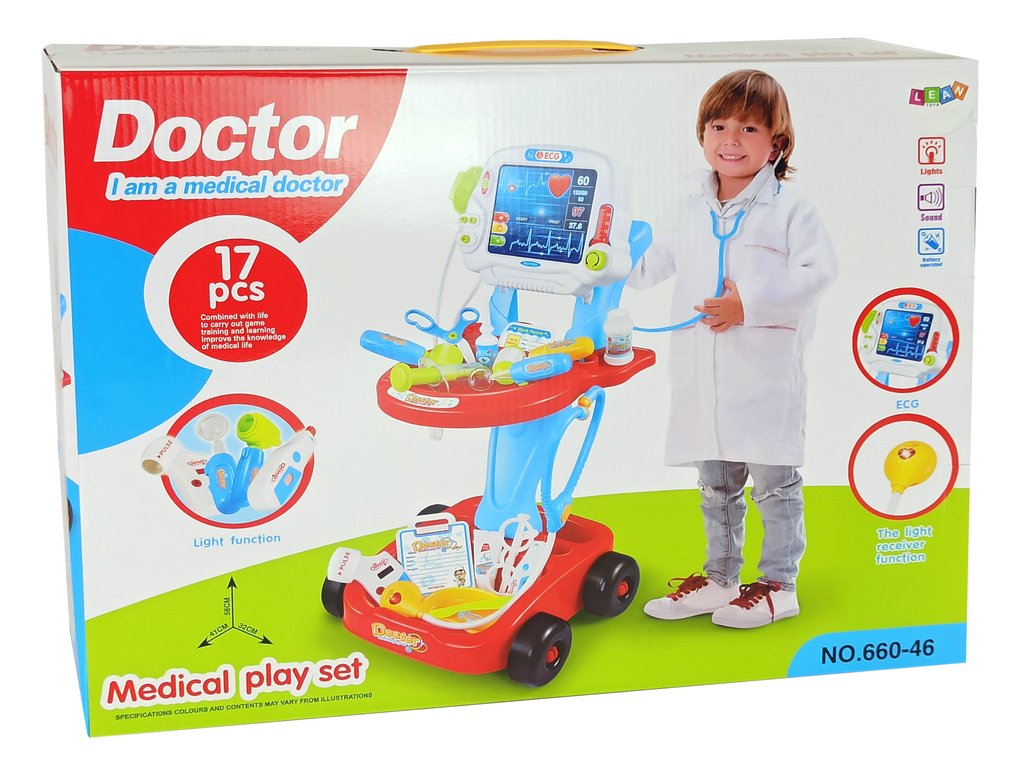 Součástí sady je stabilní vozík na čtyřech kolech s držadlem, dvěma přihrádkami na lékařské předměty a tabulí. EKG je ideální pro budoucí malé lékaře.