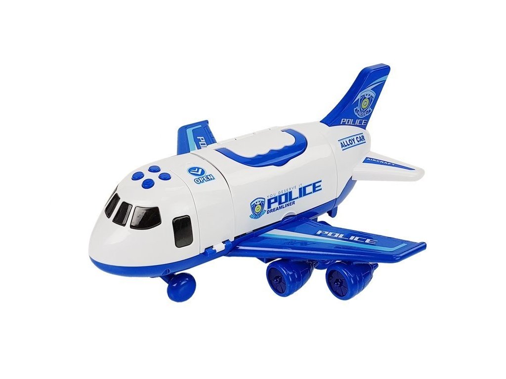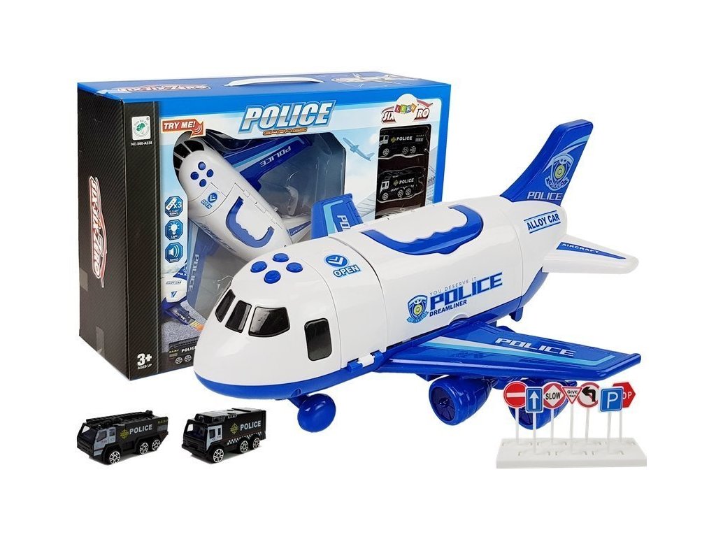Letadlo pro přepravu vozidel je vyrobeno v měřítku 1:64. Letadlo má otevíratelnou stranu, takže vám umožní uschovat autíčka uvnitř. Na horní částí letadla se nachází rukojeť. Letadlo má zvukové a svítící efekty. V balení se nachází tři policejní auta.