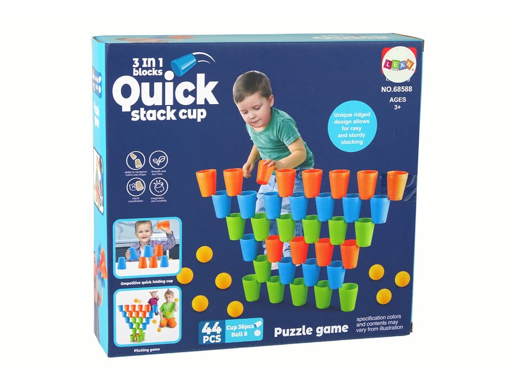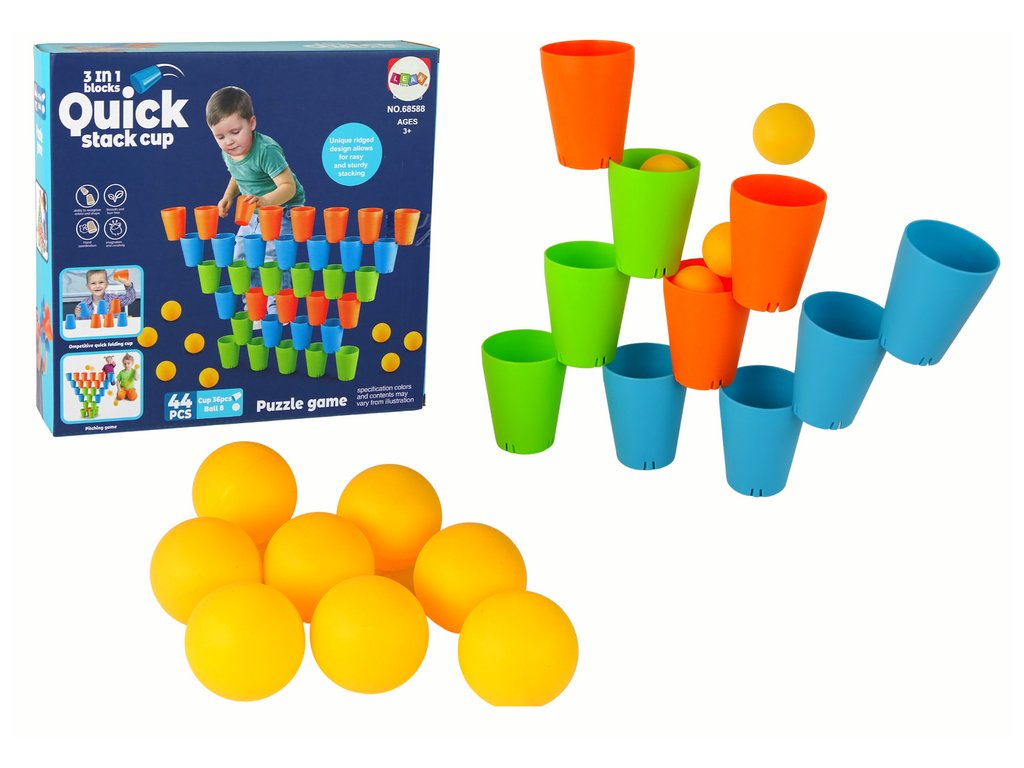 Logická hra 3v1 je fantastická zábava pro děti. Sada obsahuje 44 prvků: 12 modrých, 12 oranžových a 12 zelených kelímků, které lze kombinovat a vytvářet pyramidy. Sada navíc obsahuje 8 pingpongových míčků, díky kterým si můžete procvičit svou přesnost.