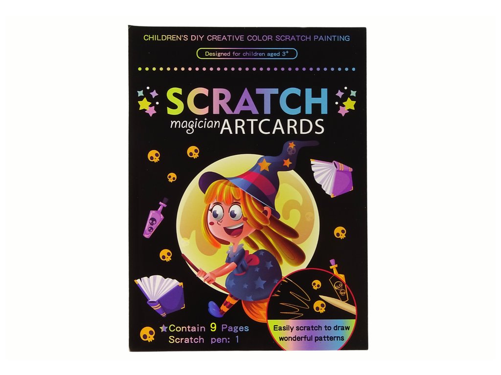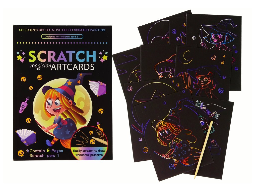 V sadě najdete 9 stíracích obrázků, které ožívají před očima vašeho dítěte. Pomocí speciální dřevěné tyčinky můžete seškrábat černou vrstvu na obrázku a odhalit tak krásné a barevné ilustrace. Tyto ilustrace zobrazují různé čarodějnice.