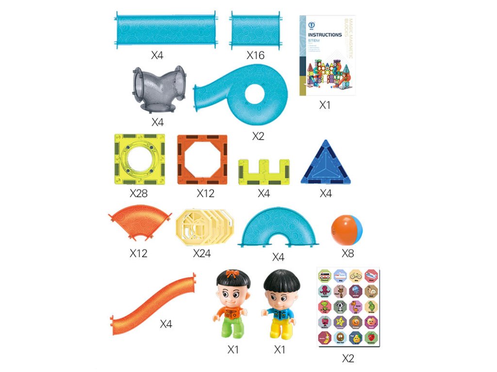 - Celkem 128 Dílků: Obsahuje konstrukční elementy, 8 kuliček a vše potřebné k sestavení skluzavky.