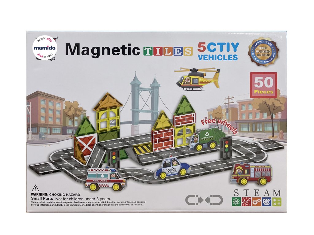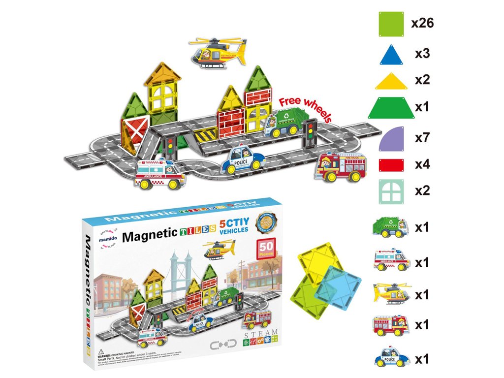 Kreativní magnetická stavebnice s velkými 7,5cm dílky přináší dětem možnost postavit vlastní město plné domů, mostů, věží a silnic. Městská série obsahuje 50 barevných magnetických dílků různých tvarů spolu s malými vozidly, která dodávají stavbám živý a hravý charakter. Silné magnety zajišťují stabilitu konstrukcí a umožňují dětem vymýšlet stále nové nápady.