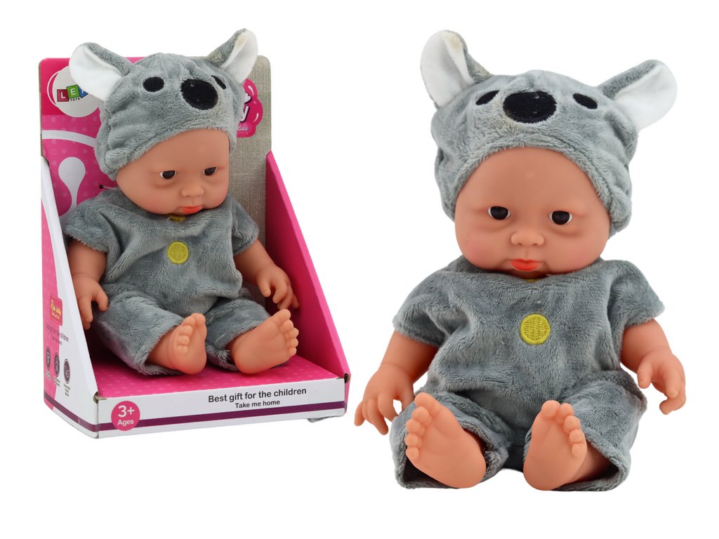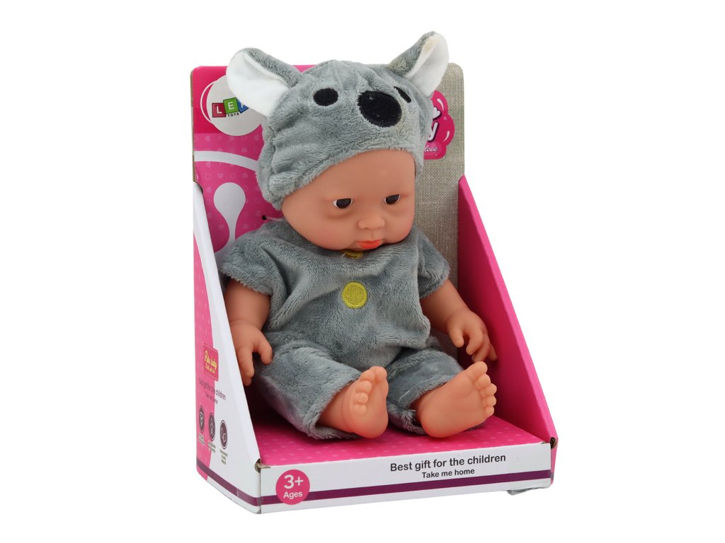 Malá panenka batole v šedém oblečku a čepičce koala