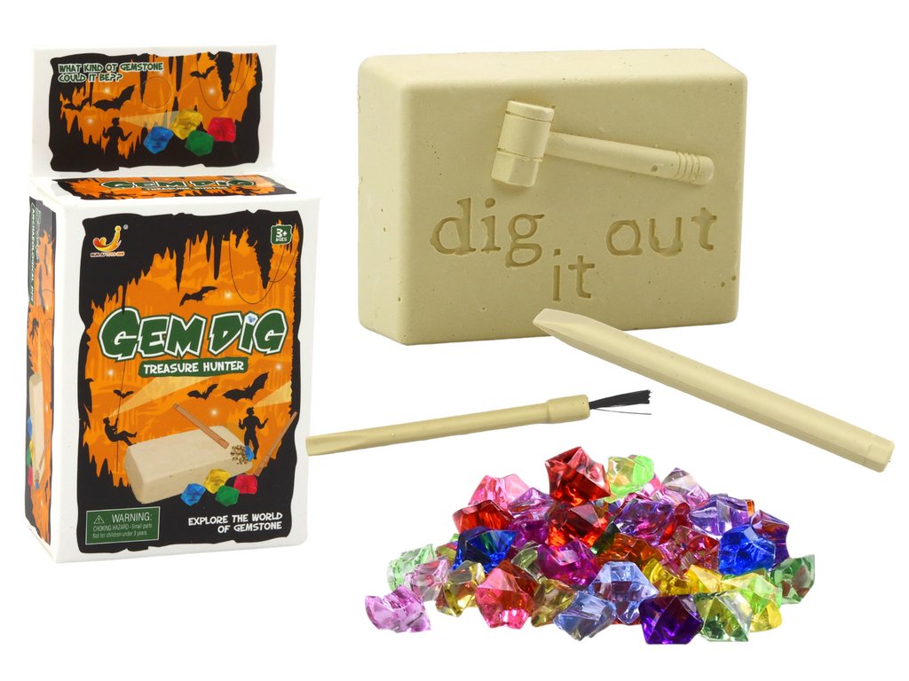 V sadě naleznete sádrovou kostku, která skrývá ukryté diamanty – poklady čekající na objevení. Díky přiloženým dvěma speciálním nástrojům lze krystaly vyndat ze sádry, odkryvat jejich krásu a tajemnou povahu.