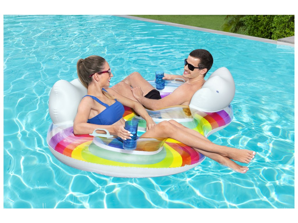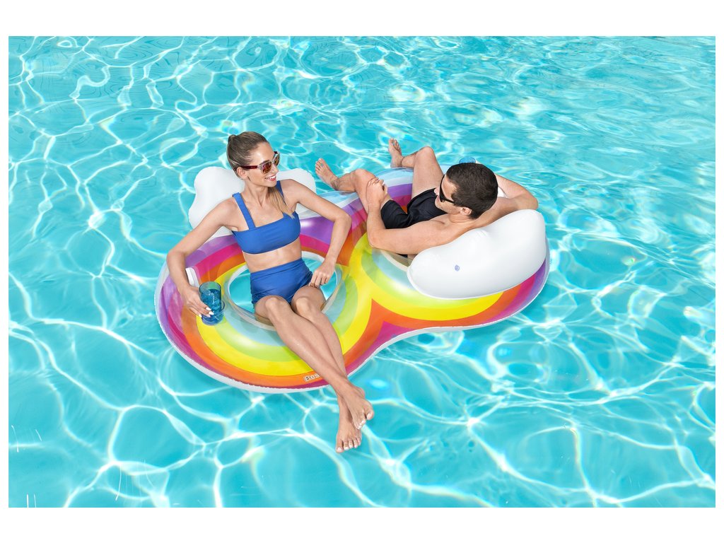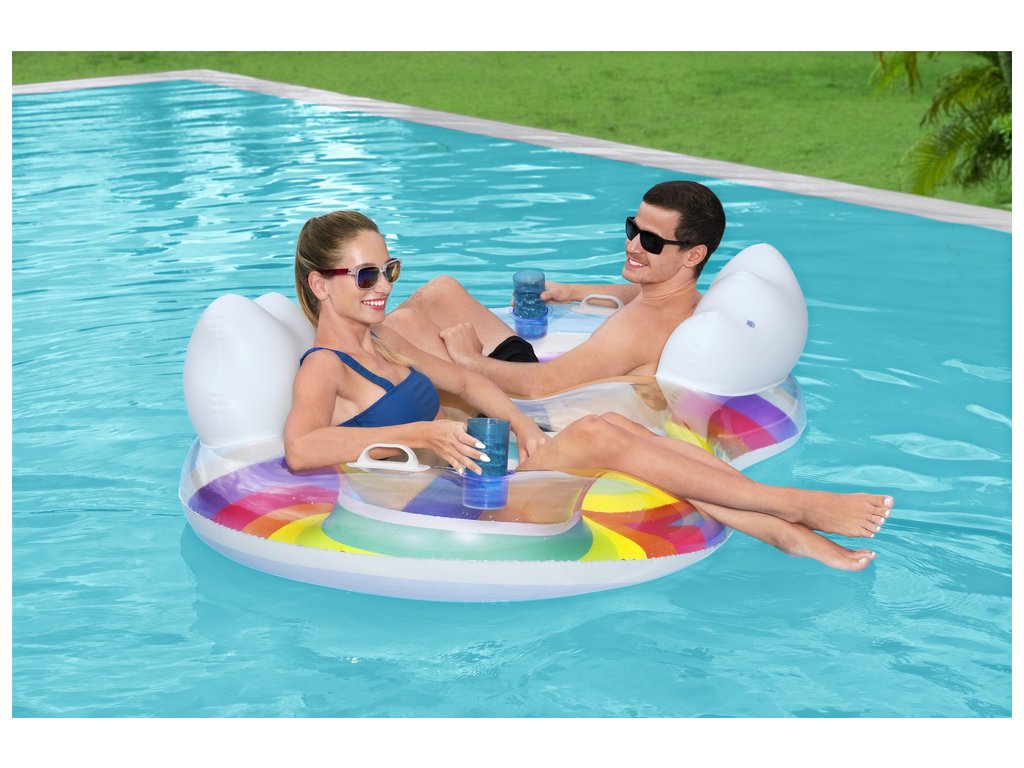 Kruh je určen pro dvě osoby. Zajímavý design vám umožní trávit společné chvíle s vaší drahou polovičkou. Je vyroben z odolného PVC materiálu odolného proti poškození a slunečnímu záření. Má zabudované opěrky hlavy a držáky na nápoje.
