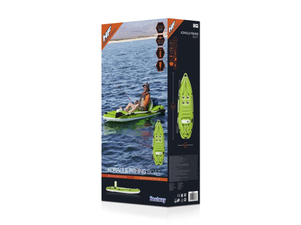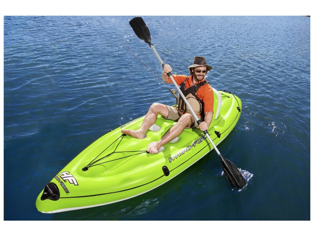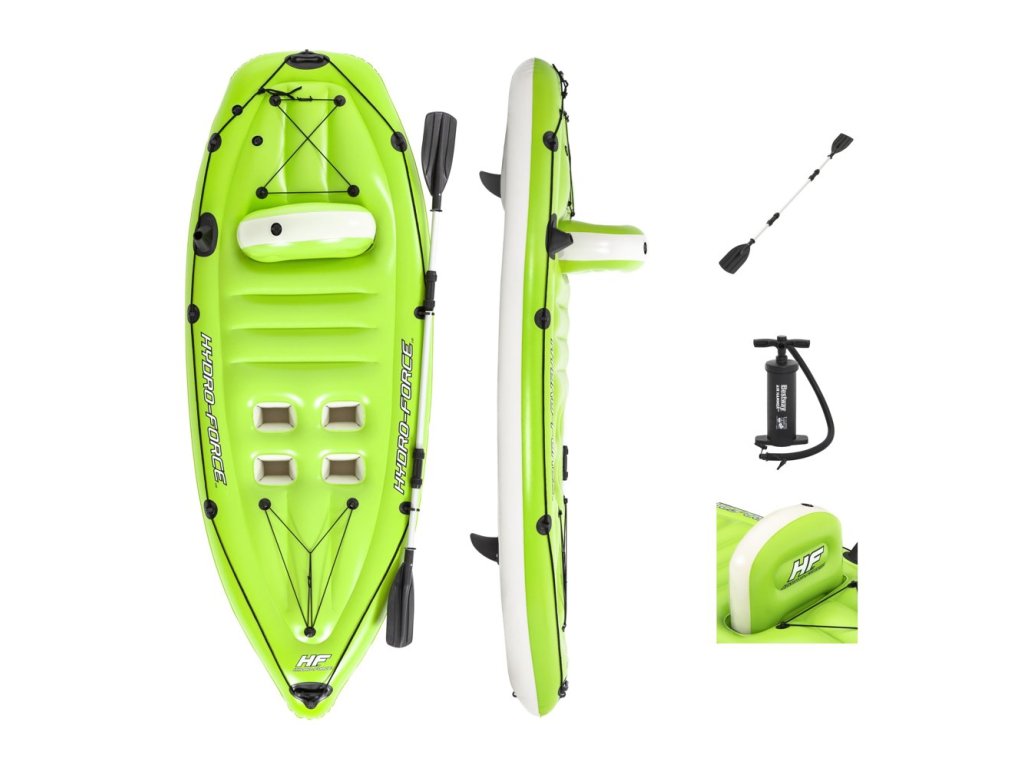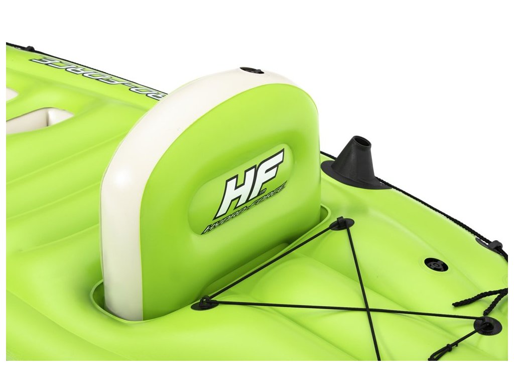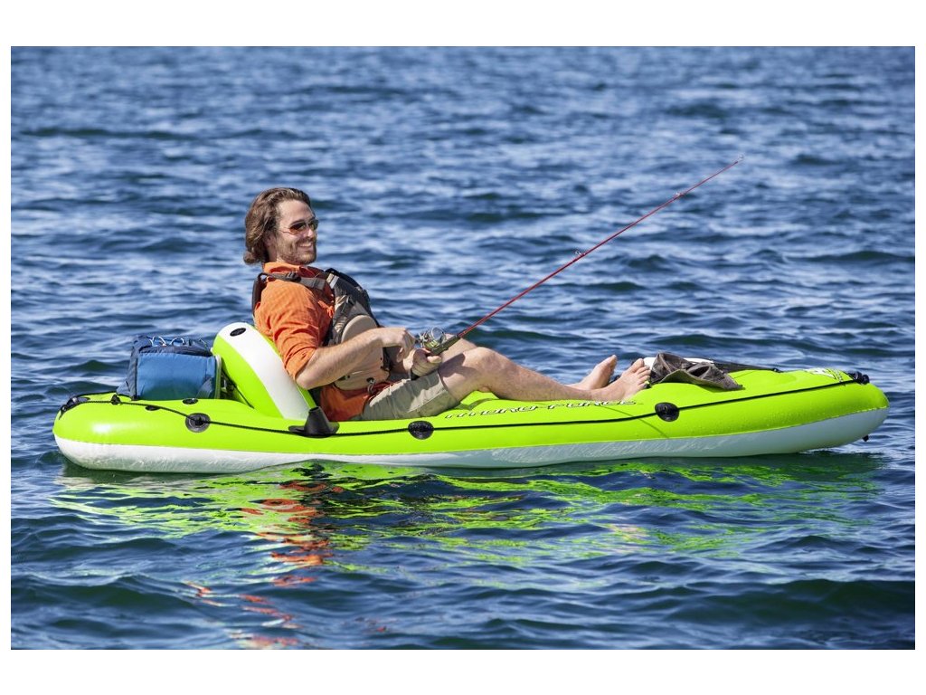 Rybářský kajak disponuje vestavěnými držáky prutů a upevňovacích prvků pádla. Kajak má také nafukovací opěradlo pro maximální relaxaci a 4 opěrky nohou pro uživatele různých výšek. Vhodný pro přepravu a kompaktní skladování.
