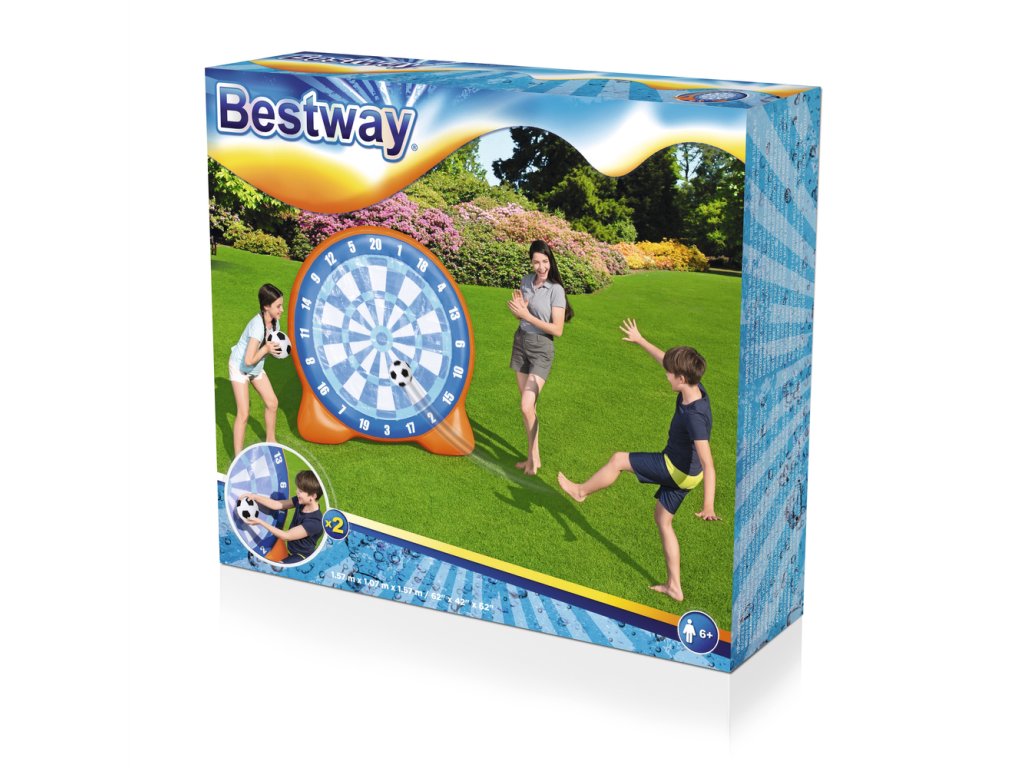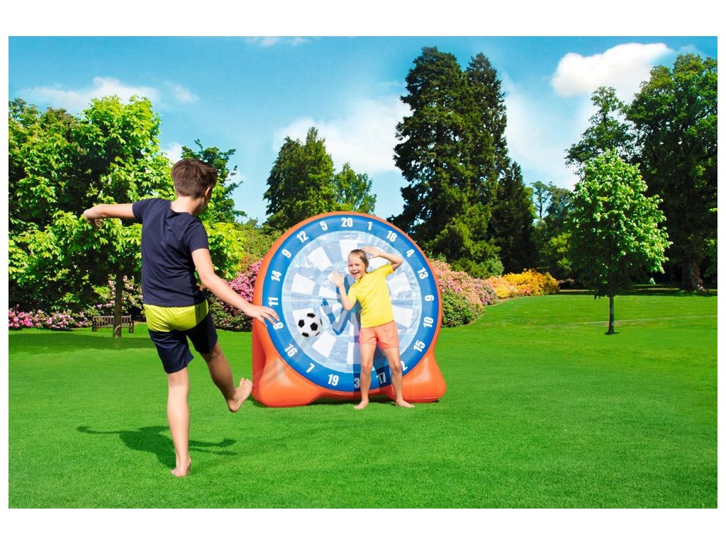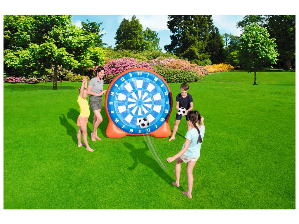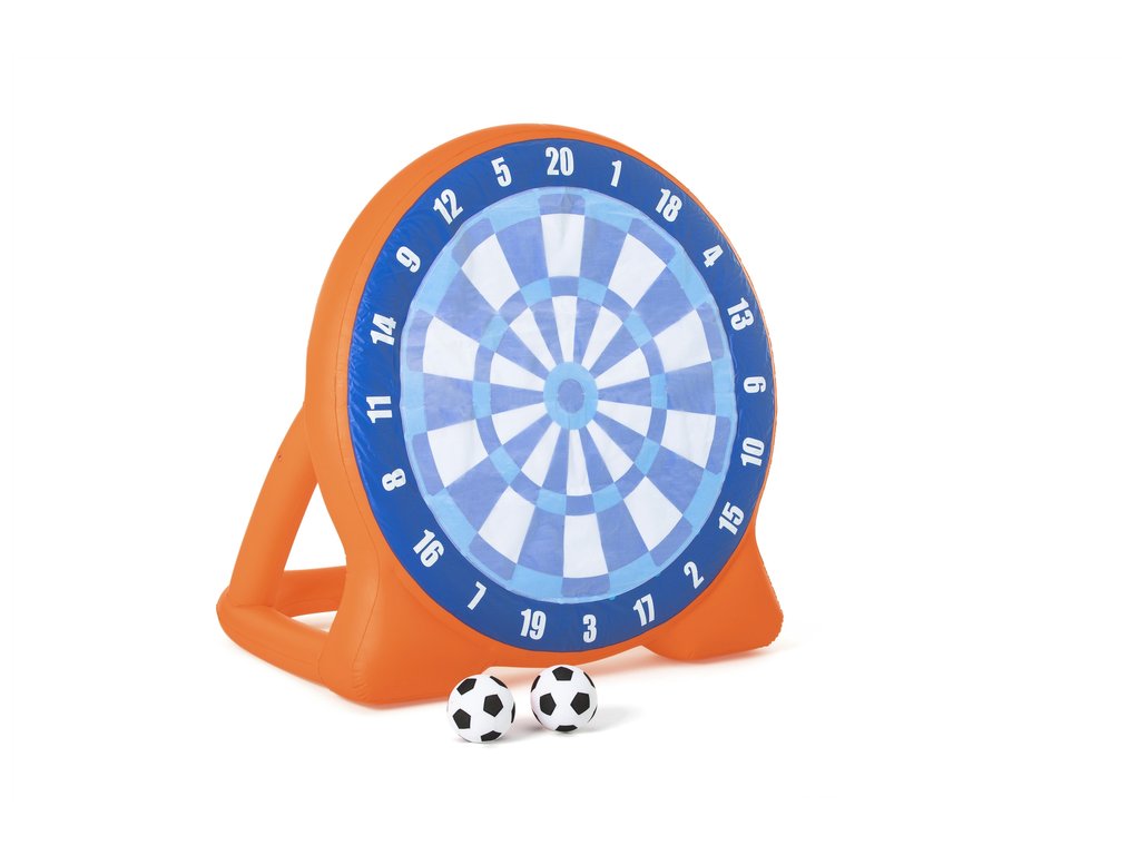 Nafukovací terč s míčky je ideální zábavou na zahradu. Přiložené míčky se k terči lepí, takže můžete snadno počítat získané body a soutěžit s přáteli. Základna terče je naplněna vodou pro udržení větší stability. Terč je vyroben z odolného vinylu o tloušťce 0,27 mm.