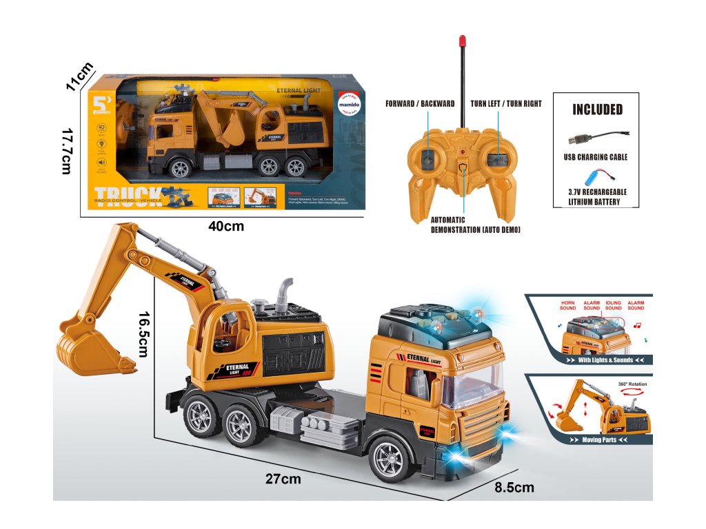 Realistický RC stavební vůz s bagrem nabízí dětem zábavu plnou akce. Model lze ovládat ve všech směrech – vpřed, vzad, vlevo i vpravo. Bagr je plně pohyblivý a jeho rameno se otáčí o 360°. Díky světelným a zvukovým efektům působí hra ještě realističtěji.