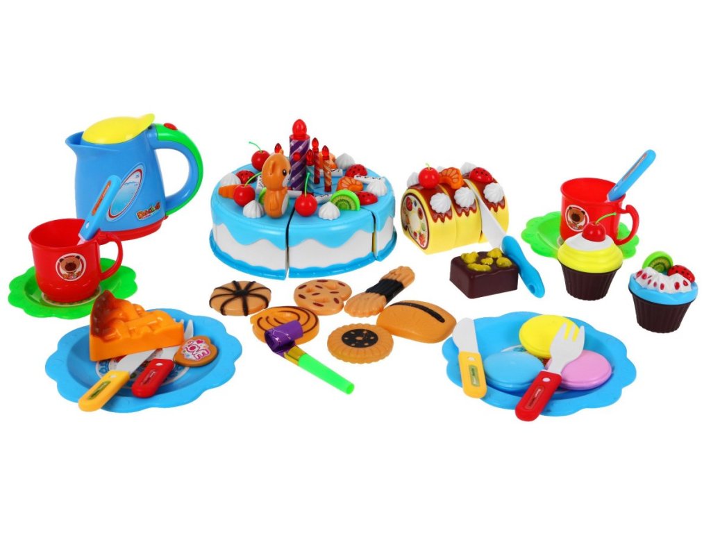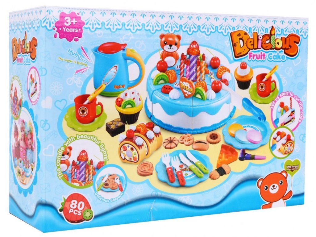 Tento dětský narozeninový set se skládá z 80 elementů, jako jsou například ovoce, příbory, cukrovinky a také dort, který se skládá z 6 kusů spojených suchým zipem. Máme zde i možnost dort nakrájet nožem připraveným v sadě. Dítě může ozdobit dort podle vlastních představ, což pozitivně ovlivňuje představivost a manuální dovednosti. Dalším unikátním doplňkem je velká svíčka svítíci ve dvou barvách, k aktivaci je potřeba na svíčce stiskout tlačítko.