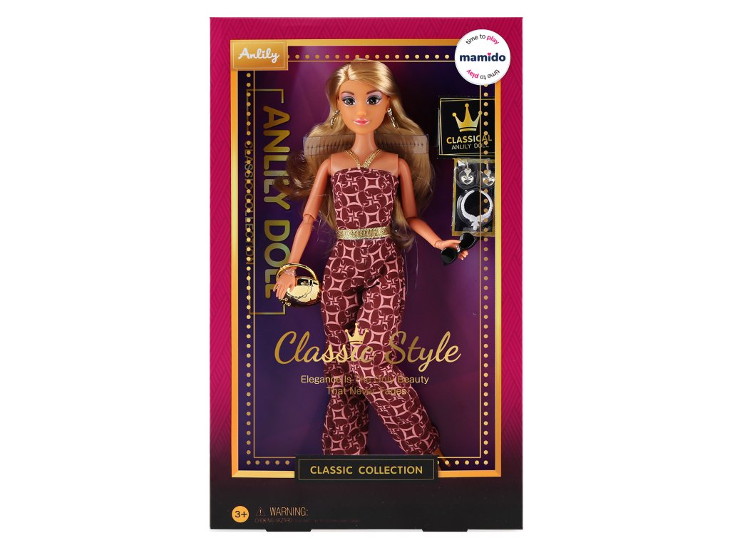 Objev kouzlo elegance s panenkou Anlily Classic Style ve velikosti 29 cm. Panenka s hnědou pletí je oblečena do moderního overalu s originálním vzorem, zlatým páskem a stylovými doplňky. Součástí balení je kabelka a sada šperků, které dodají hře nádech luxusu a kreativity. Perfektní volba pro malé milovnice módy a sběratelky.