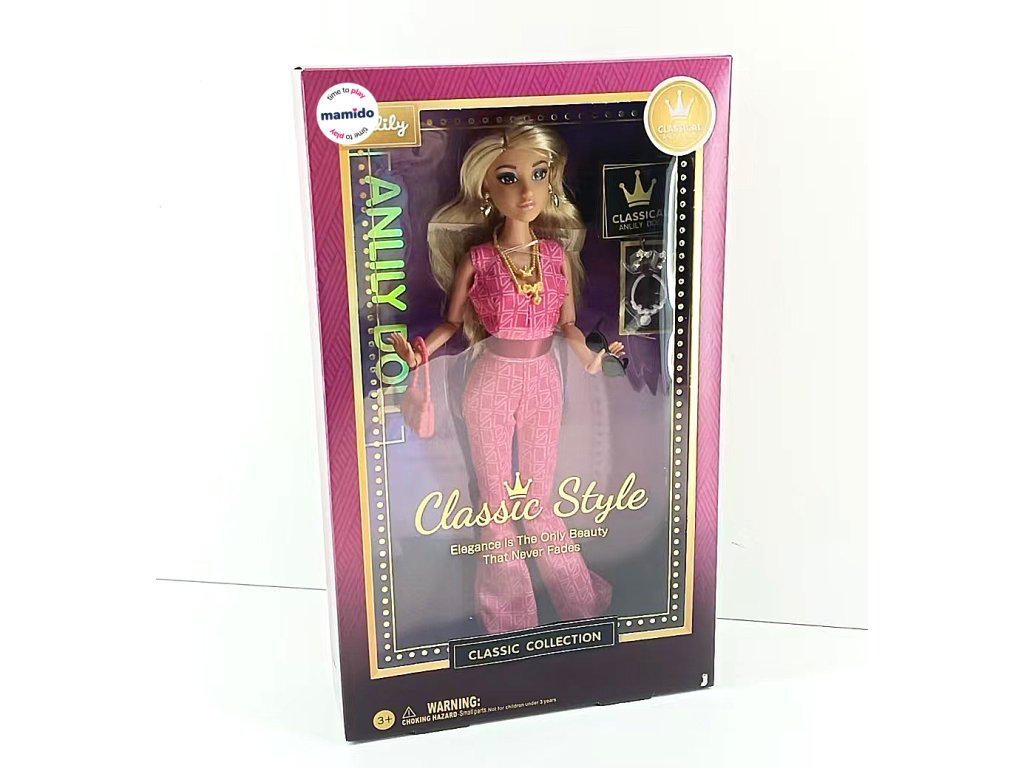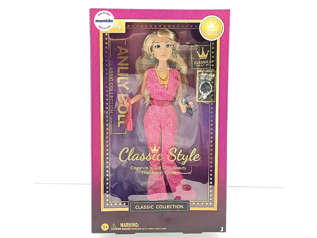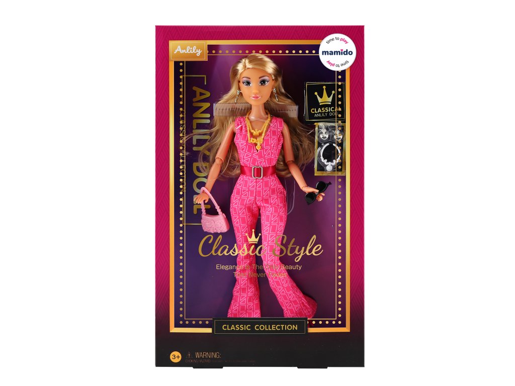 Objev kouzlo elegance s panenkou Anlily Classic Style ve velikosti 29 cm. Panenka s hnědou pletí je oblečena do moderního overalu s originálním vzorem, páskem a stylovými doplňky. Součástí balení je kabelka a sada šperků, které dodají hře nádech luxusu a kreativity. Perfektní volba pro malé milovnice módy a sběratelky.