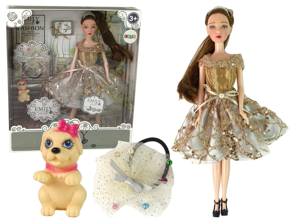 Představujeme rozkošnou panenku Emily s dlouhými tmavými vlasy a modrýma očima, oblečenou do elegantních hnědých šatiček zdobených zlatými flitry a mašlí s perlou. Vlasy má sčesané do culíku a ozdobené diadémem. Emily má na sobě krásné černé vysoké podpatky zdobené růží.