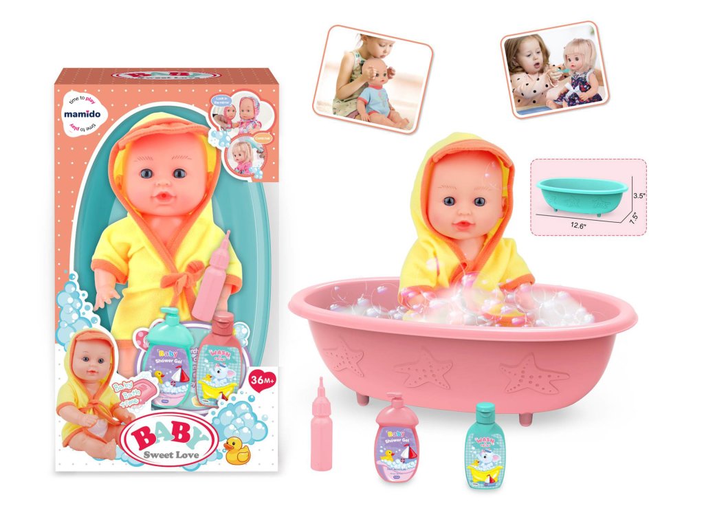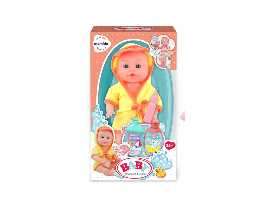 Roztomilé koupací miminko přinese dětem spoustu zábavy při každodenním hraní! Panenka o velikosti 30 cm je oblečená do hebkého župánku a doprovází ji kompletní sada koupacích doplňků – vanička, lahvička, koupací gel a šampon. Ideální hračka pro péči, napodobování dospělých a rozvoj dětské fantazie.