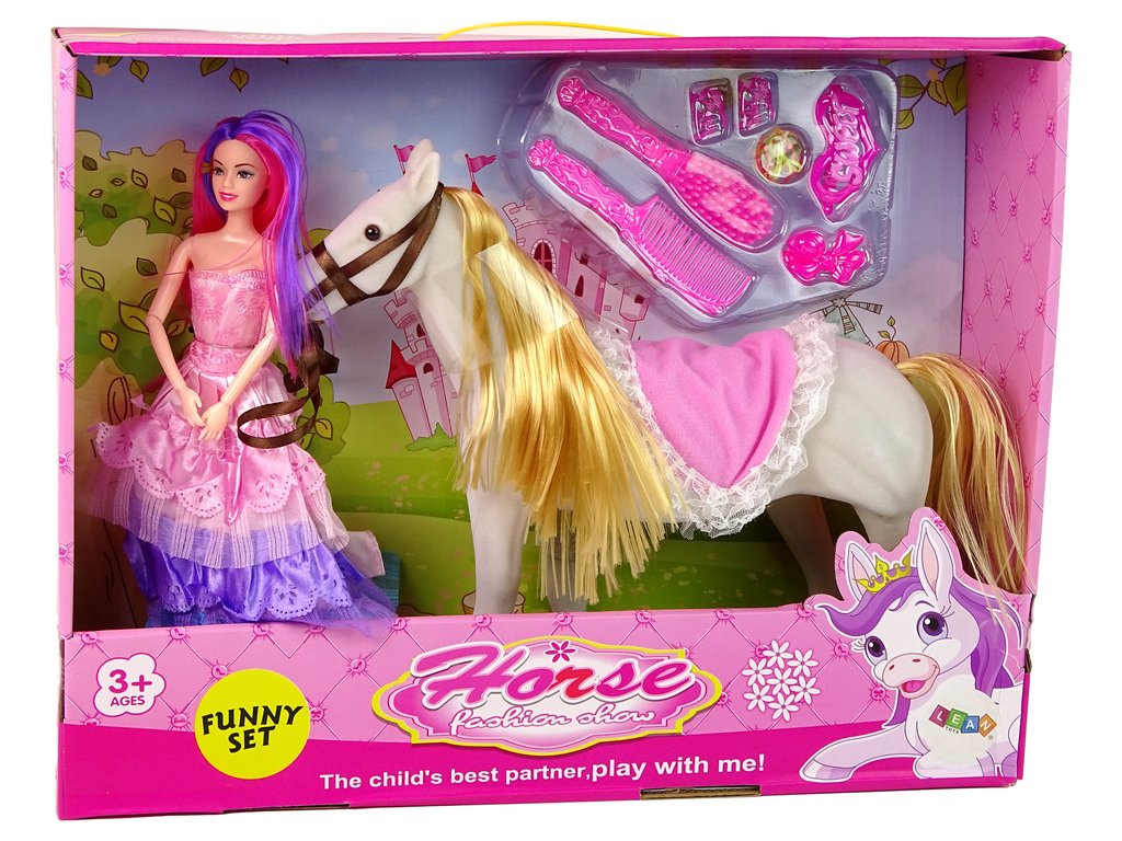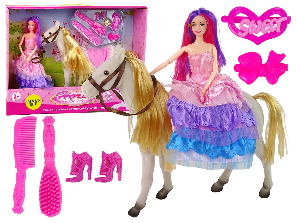 | Obsah balení: | Panenka, Kůň, Gumičky, Sponky, Kartáč, Hřeben, Boty |