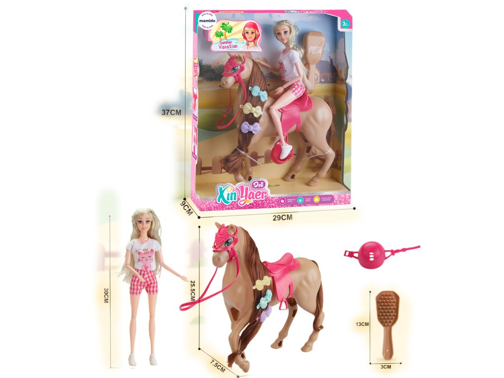 Součástí balení je panenka, kůň se sedlem a uzdou, barevné ozdoby do hřívy, hřeben a jezdecká helma, které dodají hře na autentičnosti. Celý set je ideální pro holčičky, které milují koně, péči o zvířátka a stylovou zábavu. Set podporuje kreativní hru, rozvoj fantazie a představivosti a umožňuje dětem vytvářet vlastní příběhy z jezdeckého prostředí. Skvěle se hodí jak na samostatnou hru, tak i pro společné hraní s kamarády.