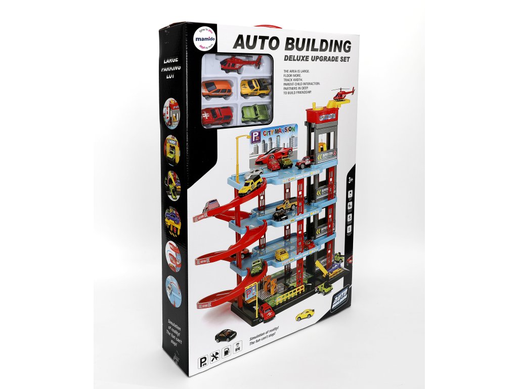 Díky bohaté výbavě s 6 kovovými autíčky, helikoptérou a samolepkami si děti mohou postavit vlastní městské parkoviště a užít si realistickou hru plnou fantazie. Výhodou jsou také pohyblivé výtahy a sjezdy, které dodávají hře dynamiku a zábavu.