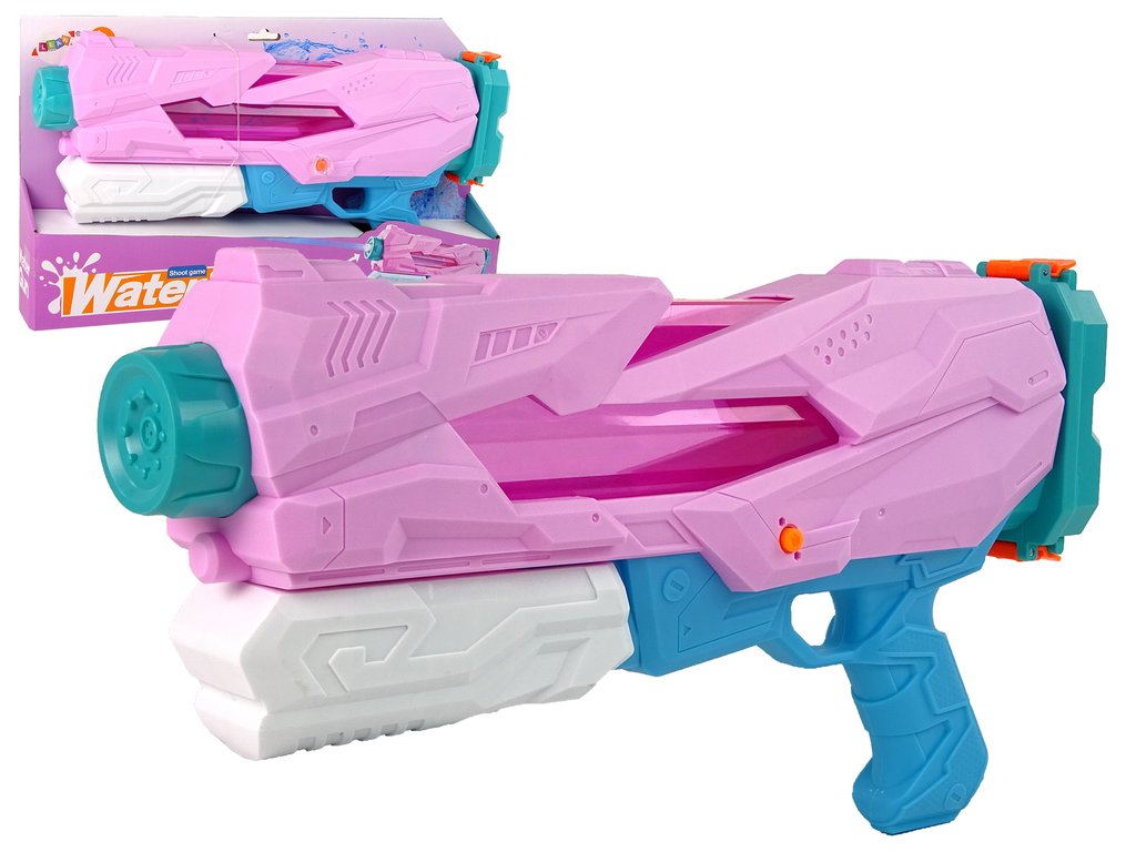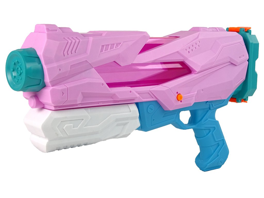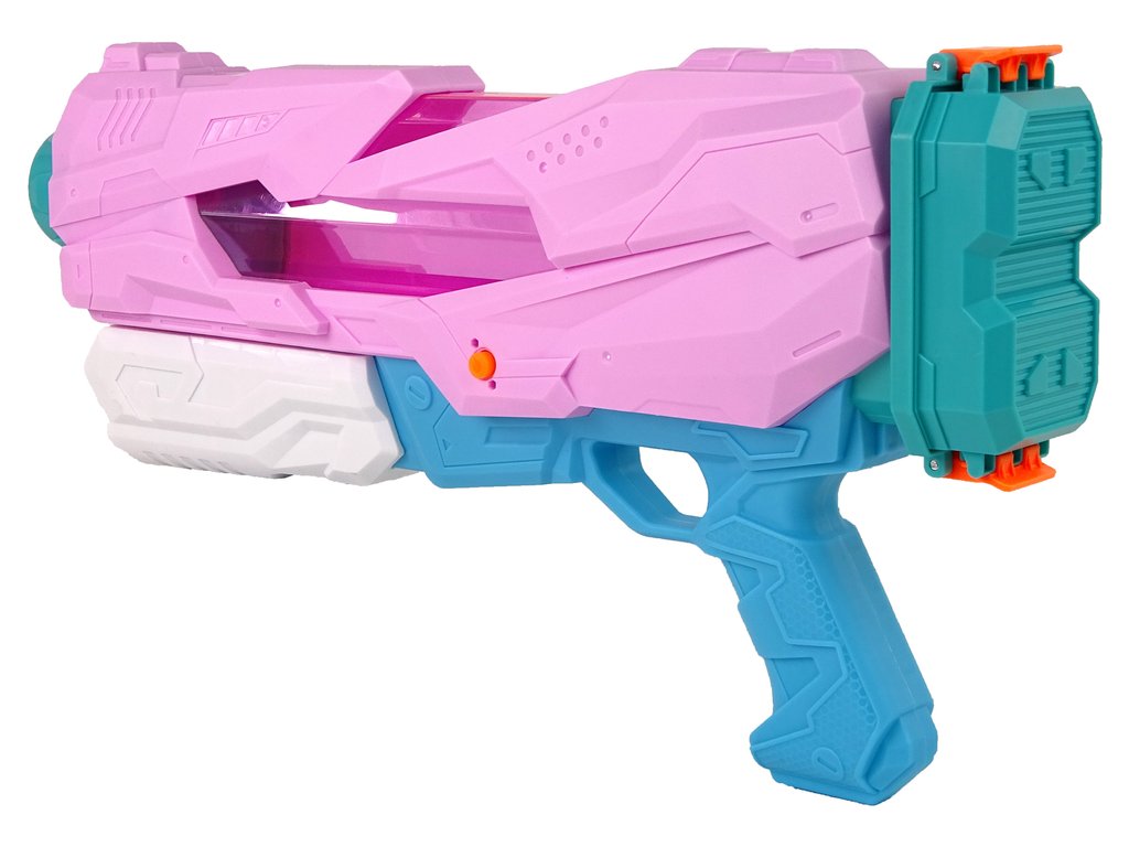 Prezentovaná vodní pistole je v růžové barvě s prvky modré. V horní části pistole je modrý uzávěr, otevřete jej a naplňte nádržku až na 80 % vodou. Kapacita celého zásobníku je 800 ml a pistole má dosah 8 m.