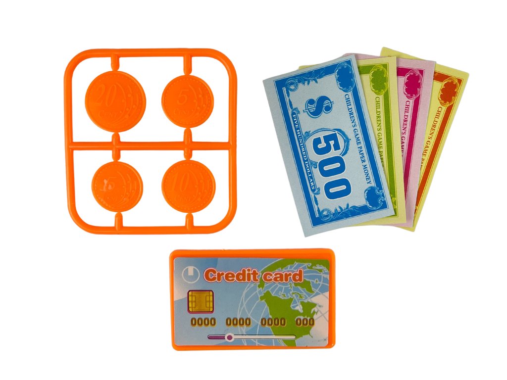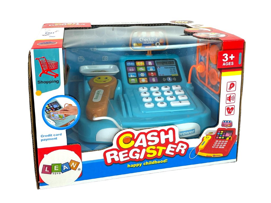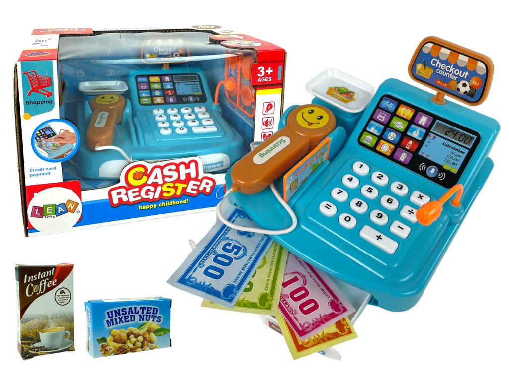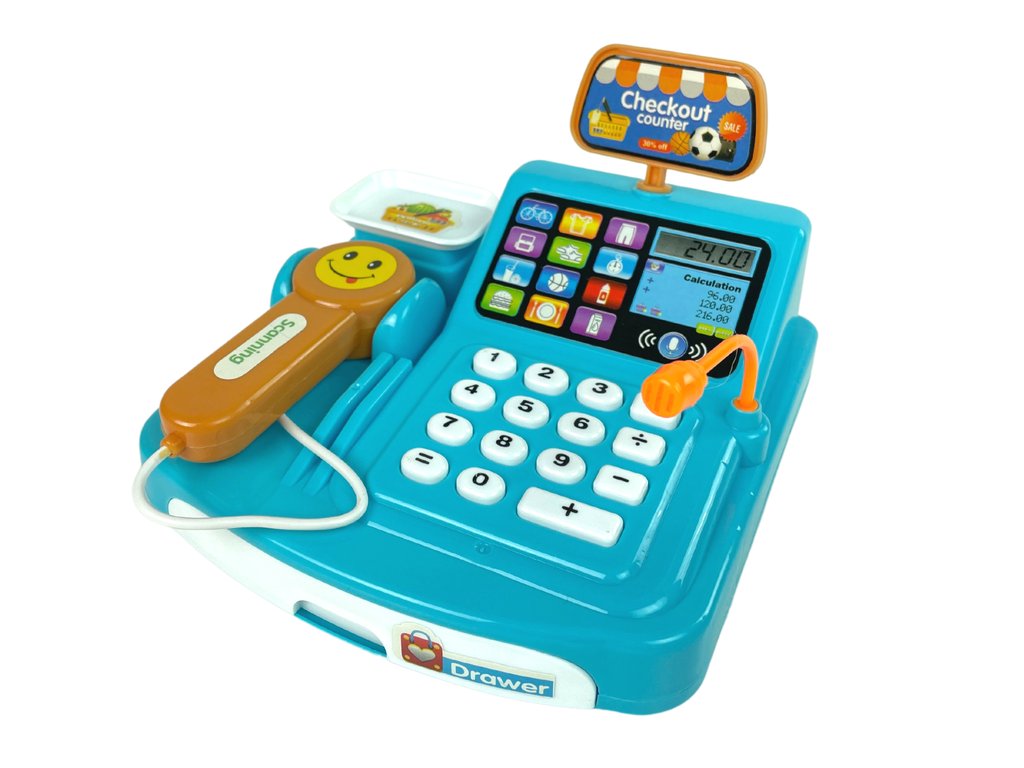 Pokladna je modrá s oranžovými prvky. Mince umožňují zaplatit za potraviny. Skener vydává realistický zvuk, který slyšíme během nákupu v supermarketu.