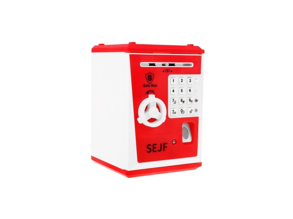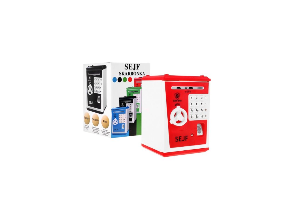 - Pokladnička na peníze ve tvaru trezoru, napájená 3 bateriemi AA 3 x 1,5 V (nejsou součástí balení)